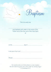 Wording: This is to certify that __________ was baptised with water in the name of the Father and of the Son and of the Holy Spirit at __________ on the __________ day of __________ in the year of our Lord __________ Minister __________.