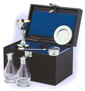 This delightful Georgian communion set offers six pieces in Silver plate: chalice (3 1/8in high), two glass cruets (each 4in high - 2 3/4 fl oz), paten (3 1/8in diameter), pyx and spoon inside a sturdy wooden case with velvet interior and leather-look veneer.