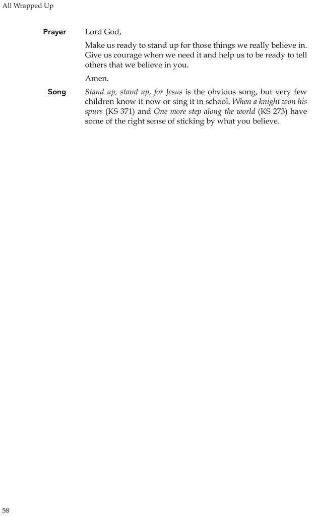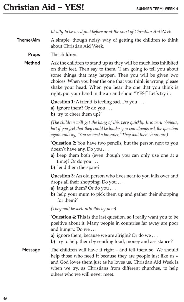 Summer Term Baptism vows 1 - creation Baptism vows 2 - the human face of God Baptism vows 3 - God at work in us Christian Aid - YES! When Christian Aid week is over - it isn't The lesson of the pet - love returned Story time - David and Goliath (1 Samuel 17) A postcard from God Who do you trust - a horoscope or God? Stand up for what you believe in