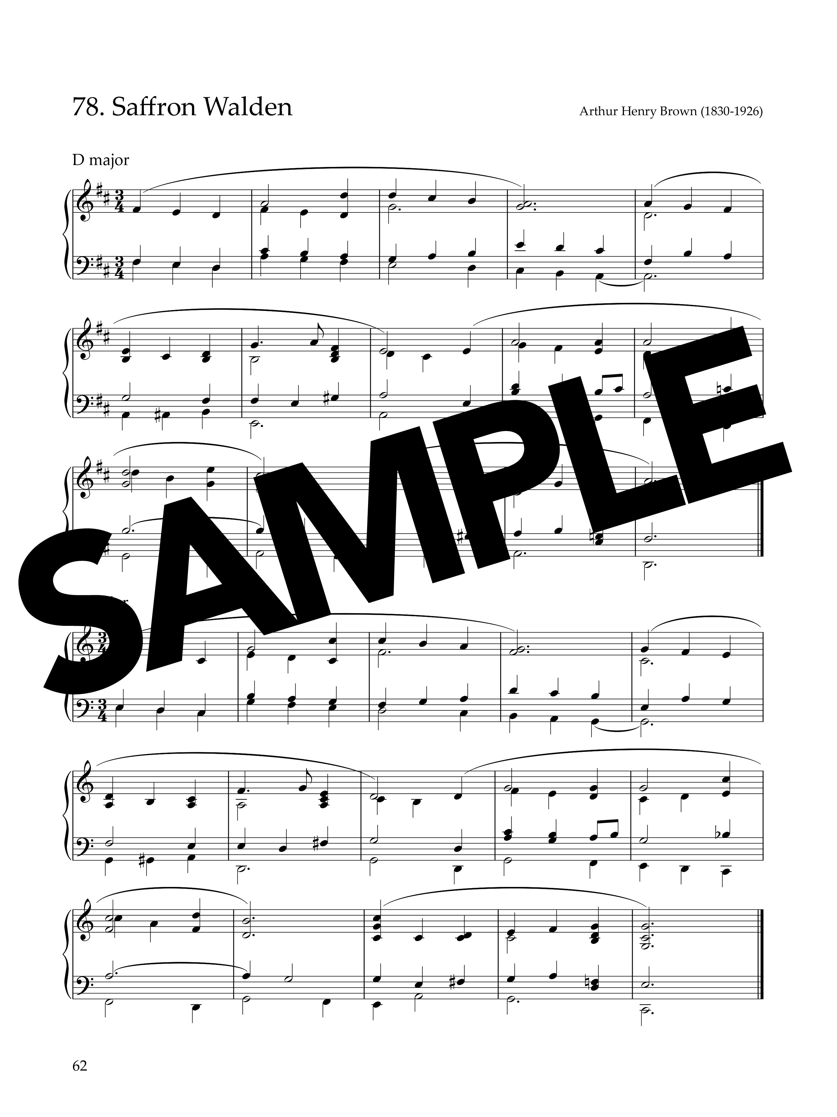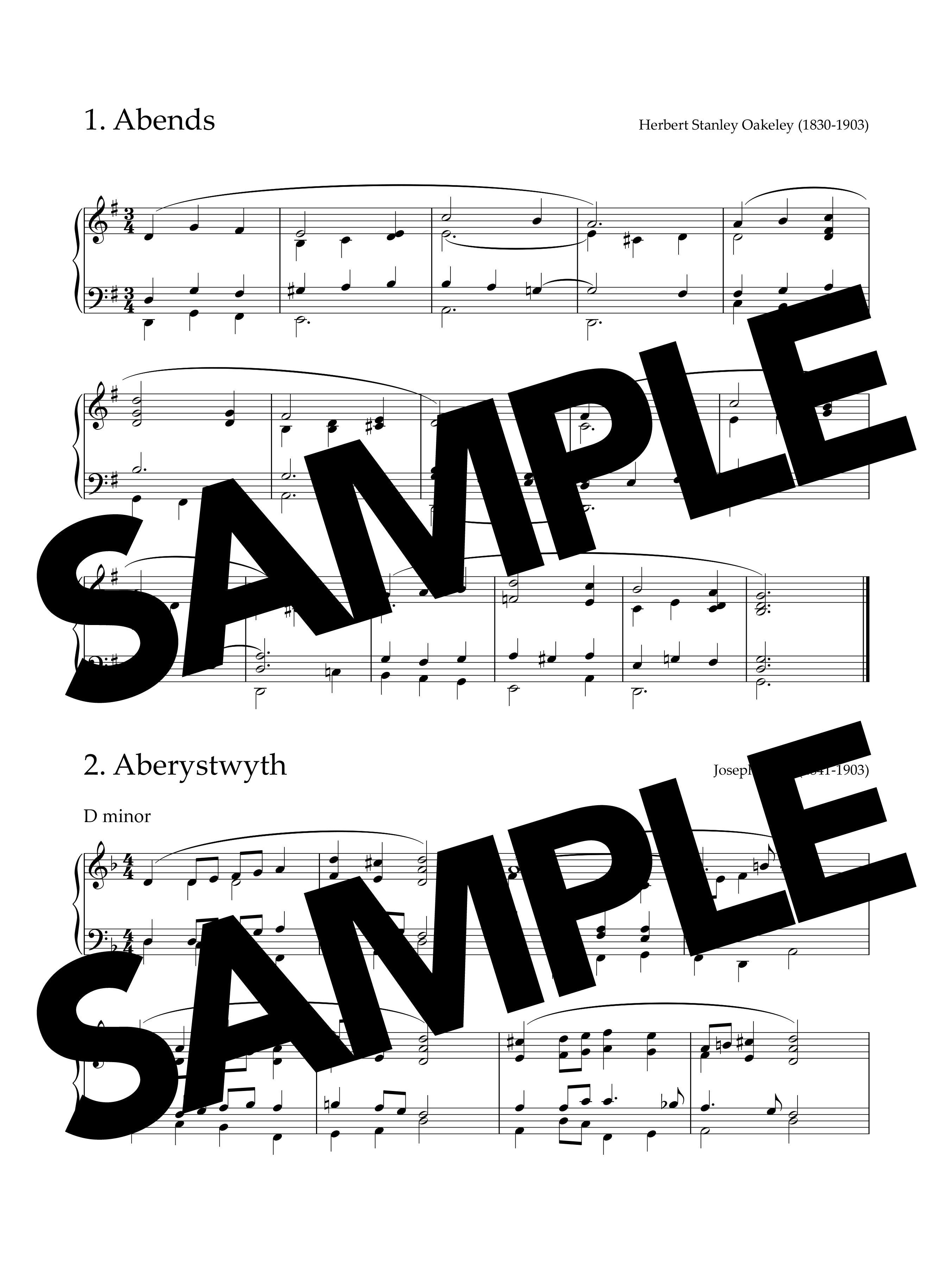 1. Abends 2. Aberystwyth 3. Adeste Fideles 4. All Things Bright and Beautiful 5. Amazing Grace 6. Angel Voices 7. Anima Christi 8. Antioch 9. Ar Hyd Y Nos 10. Aurelia 11. Austria 12. Battle Hymn 13. Billing 14. Blaenwern 15. Blessed Assurance 16. Brother James’ Air 17. Bunessan 18. Carlisle 19. Chorus Angelorum 20. Corde Natus 21. Cradle Song 22. Cranham 23. Crimond 24. Crüger 25. Cwm Rhondda 26. Diademata 27. Dix 28. Dominus Regit Me 29. Duke Street 30. Easter Hymn 31. Engelberg 32. Evelyns 33. Eventide 34. Forest Green 35. Franconia 36. Gerontius 37. God rest you merry 38. Greensleeves 39. Gwalchmai 40. Hanover 41. Horbury 42. Humility (Oxford) 43. Hyfrydol 44. In Dulci Jubilo 45. Irby 46. Kelvingrove 47. Kingsfold 48. Lasst Uns Erfreuen 49. Lobe Den Herren 50. Londonderry Air 51. Love Divine 52. Lübeck (GoY sei dank) 53. Luther’s Hymn 54. Lux Benigna 55. Maccabaeus 56. Mannheim 57. Martyrdom 58. Melita 59. Mendelssohn 60. Metzler’s Redhead 61. Misericordia 62. Monkland 63. Nicaea 64. Noel Nouvelet 65. Nottingham 66. Nun Danket 67. Ode to Joy 68. Old Hundredth 69. Paderborn 70. Penlan 71. Personent Hodie (Theodoric) 72. Praise My Soul 73. Quen Pastores 74. Repton 75. Richmond 76. Rockingham 77. Rustington 78. Saffron Walden 79. Sagina 80. St Anne 81. St Bees 82. St Clement 83. St Columba 84. St Denio 85. St Gertrude 86. St Helen 87. St Margaret 88. Sandon 89. Sing Hosanna 90. Slane 91. Stille Nacht 92. Sussex Carol 93. The First Nowell 94. This Joyful Eastertide (Vreuchten) 95. To God be the Glory 96. Westminster Abbey 97. What a Friend (Converse) 98. Will your Anchor Hold? 99. Wolvercote 100. Woodlands