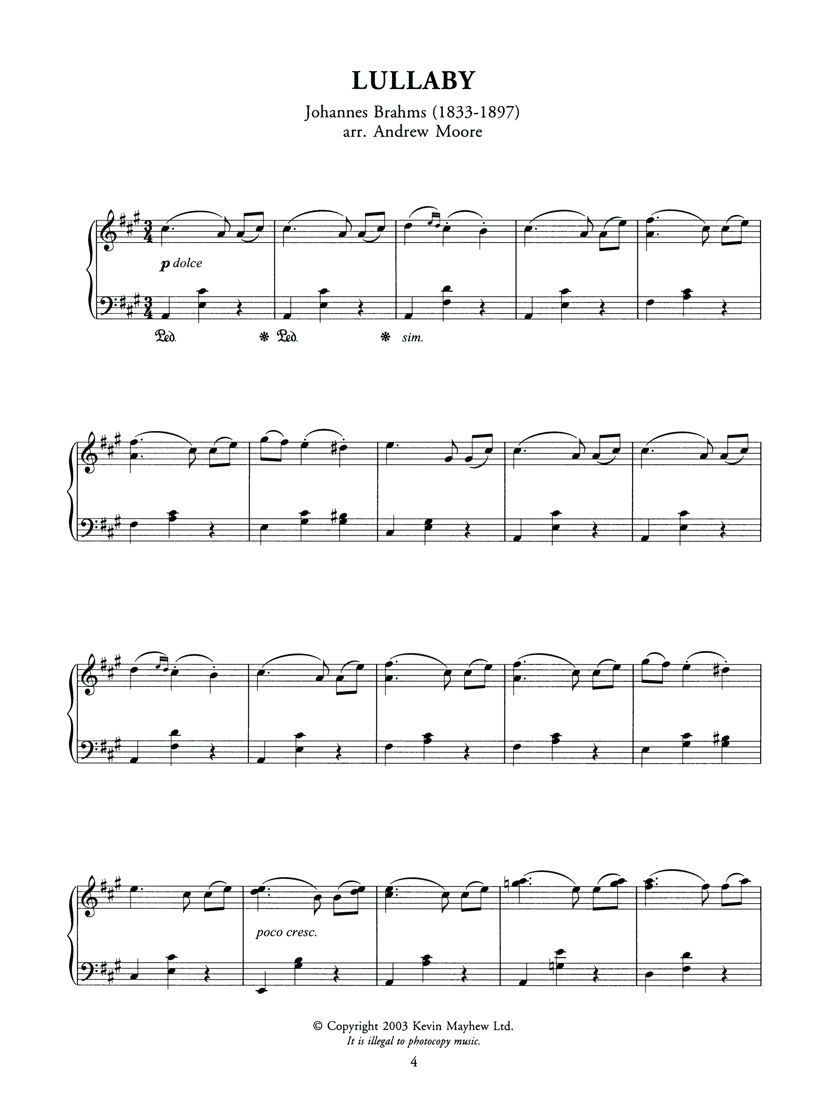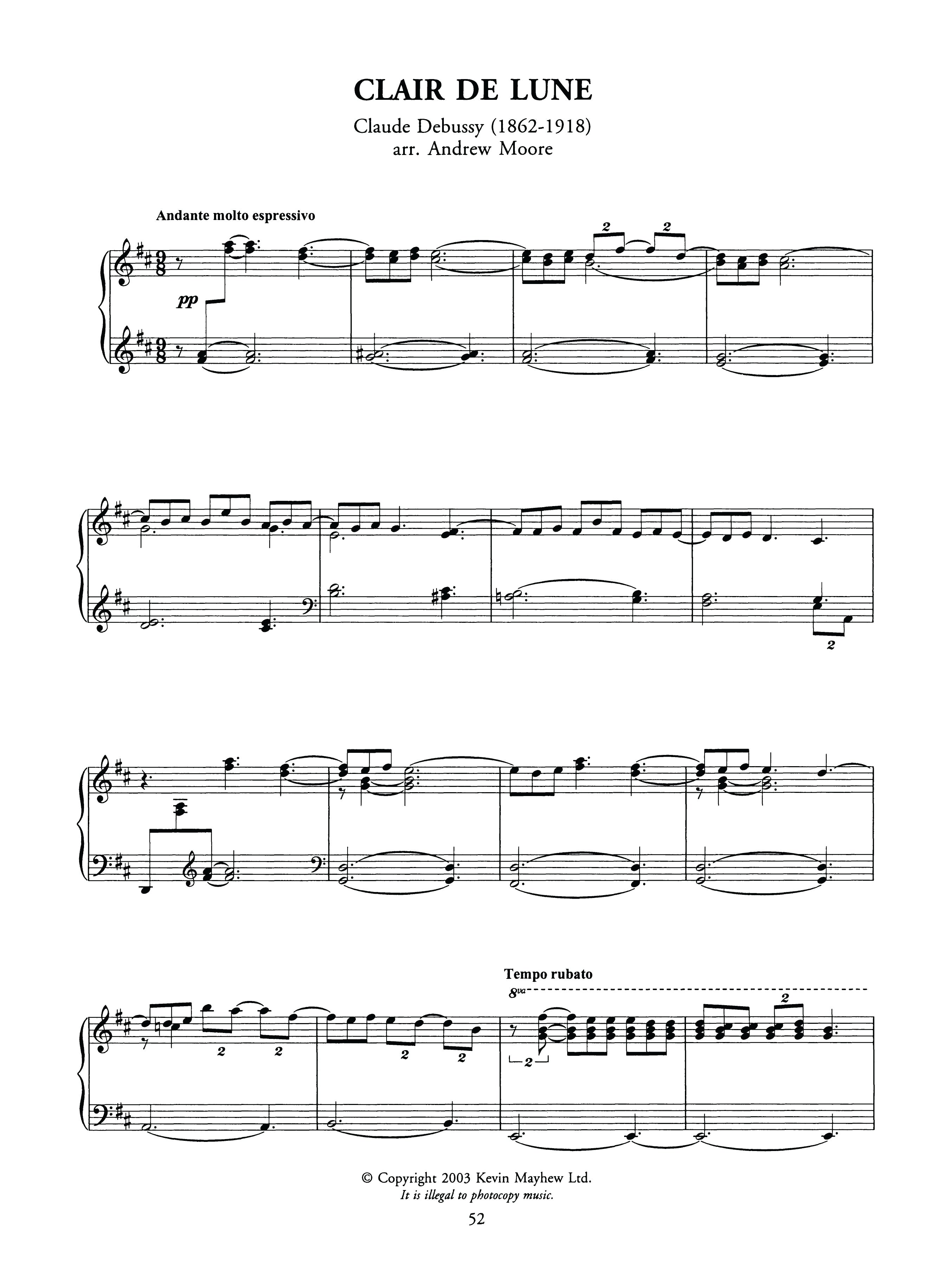 Adagio from Pathétique Sonata Op. 13 - Beethoven Andante from Piano Concerto No. 21 - Mozart Barcarolle - Mendelssohn Barcarolle - Tchaikovsky Cantabile from Fantasie-impromptu - Chopin Capriccio - Dvorák Chanson - Smetana Chanson triste - Tchaikovsky Clair de lune - Debussy Fantasiestück - Schumann First movement of Emperor Concerto - Beethoven Humoresque - Dvorák Intermezzo - Brahms Liebestraum - Liszt Lullaby - Brahms Maple leaf rag - Joplin March of the trolls - Grieg Nocturne in Eb - Chopin On the beach - Albéniz Prelude No. 4 - Fauré Romance - Mendelssohn Slow movement of Piano Concerto No. 23 - Mozart The Entertainer - Joplin The Girl with the flaxen hair - Debussy Wedding day at Troldhaugen - Grie