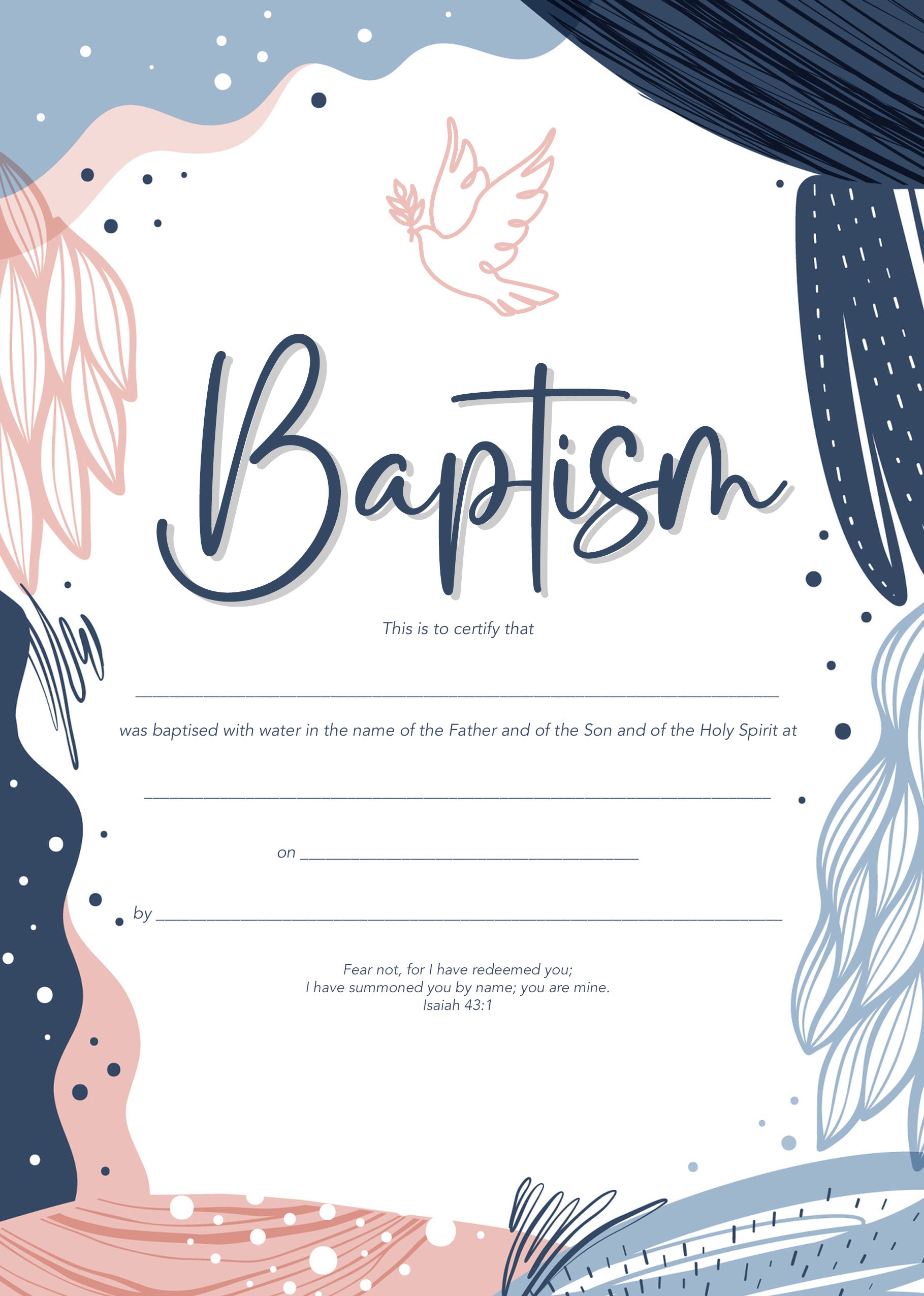 Wording: This is to certify that __________ was baptised with water in the name of the Father and of the Son and of the Holy Spirit at __________ on __________ by __________.