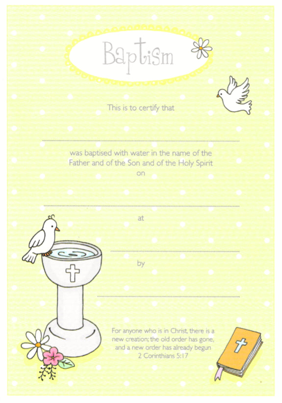 Wording: This is to certify that __________ was baptised with water in the name of the Father and of the Son and of the Holy Spirit at __________ on __________ by __________.