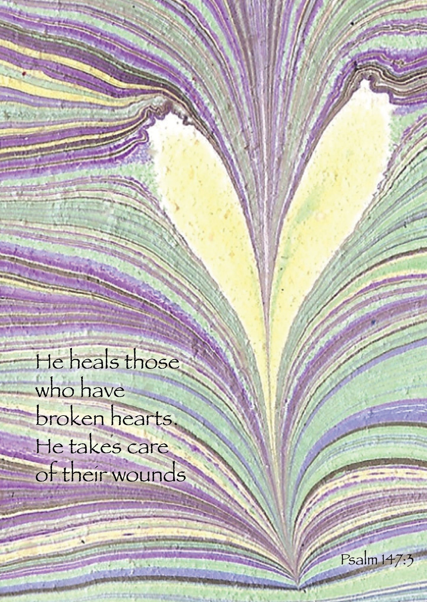 Designed by Lesley HollingworthHe heals those broken hearts, He takes care of their wounds// Psalm 147:3Printed on textured board with gold foilBlank Inside
