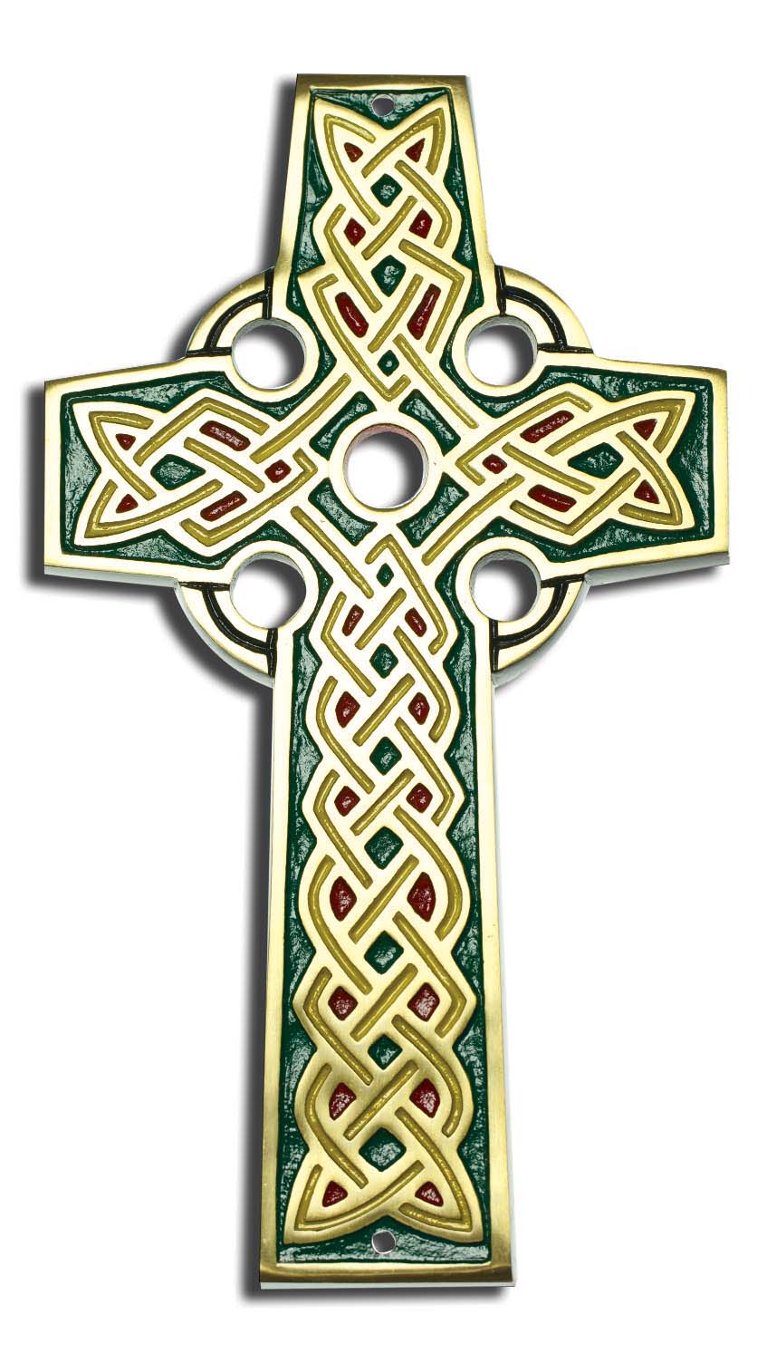 8 1/2" Solid Polished Bronze Celtic Cross with traditional interlace.Painted green, gold and red inlays.