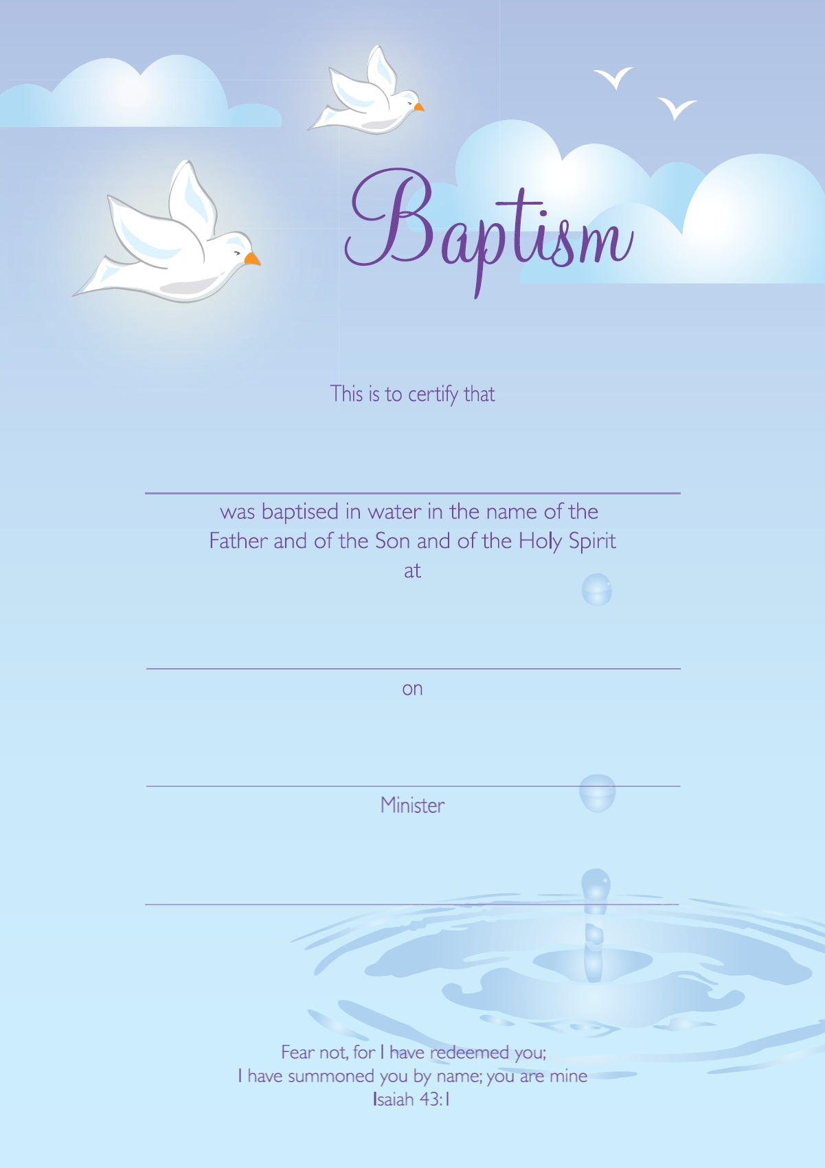 Wording: This is to certify that __________ was baptised in water in the name of the Father and of the Son and of the Holy Spirit at __________ on __________ Minister __________