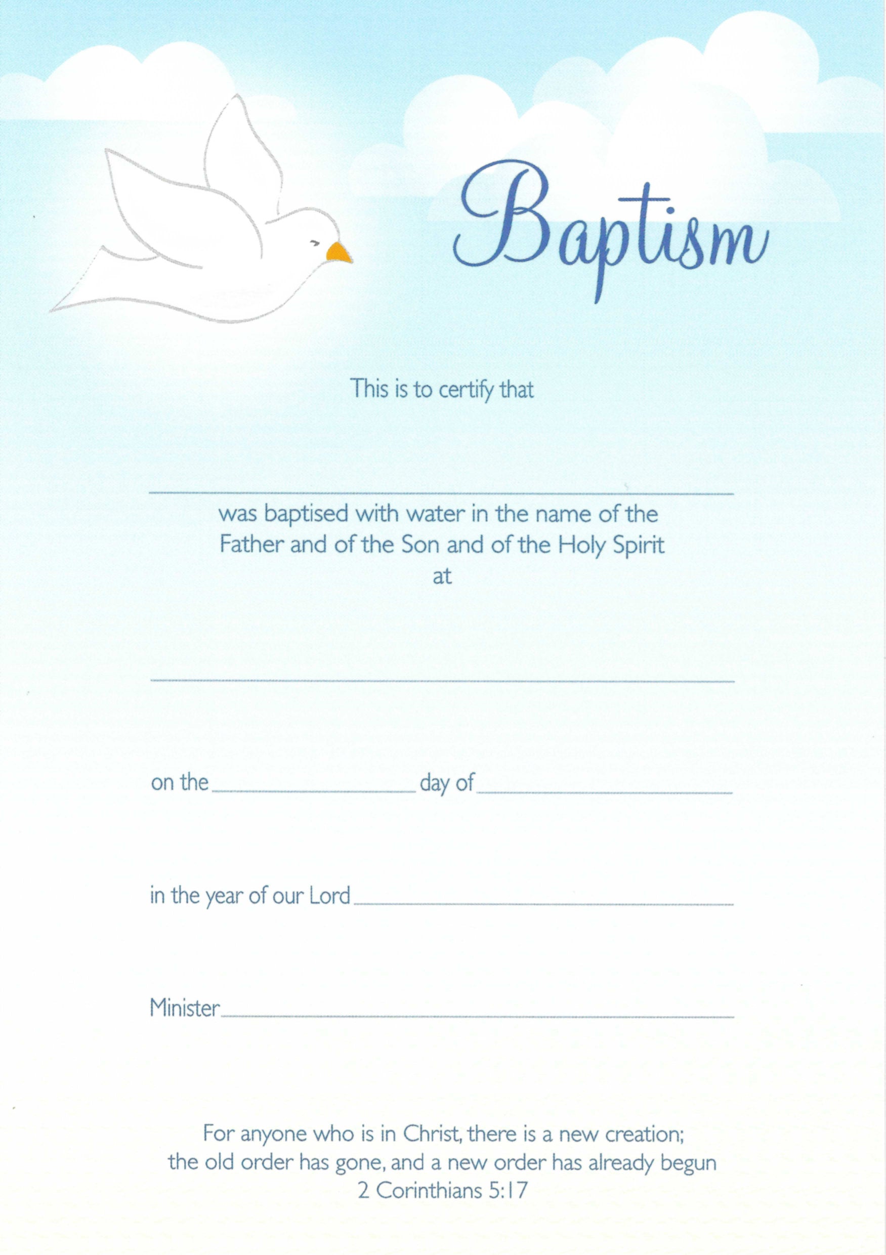 Wording: This is to certify that __________ was baptised with water in the name of the Father and of the Son and of the Holy Spirit at __________ on the __________ day of __________ in the year of our Lord __________ Minister __________.