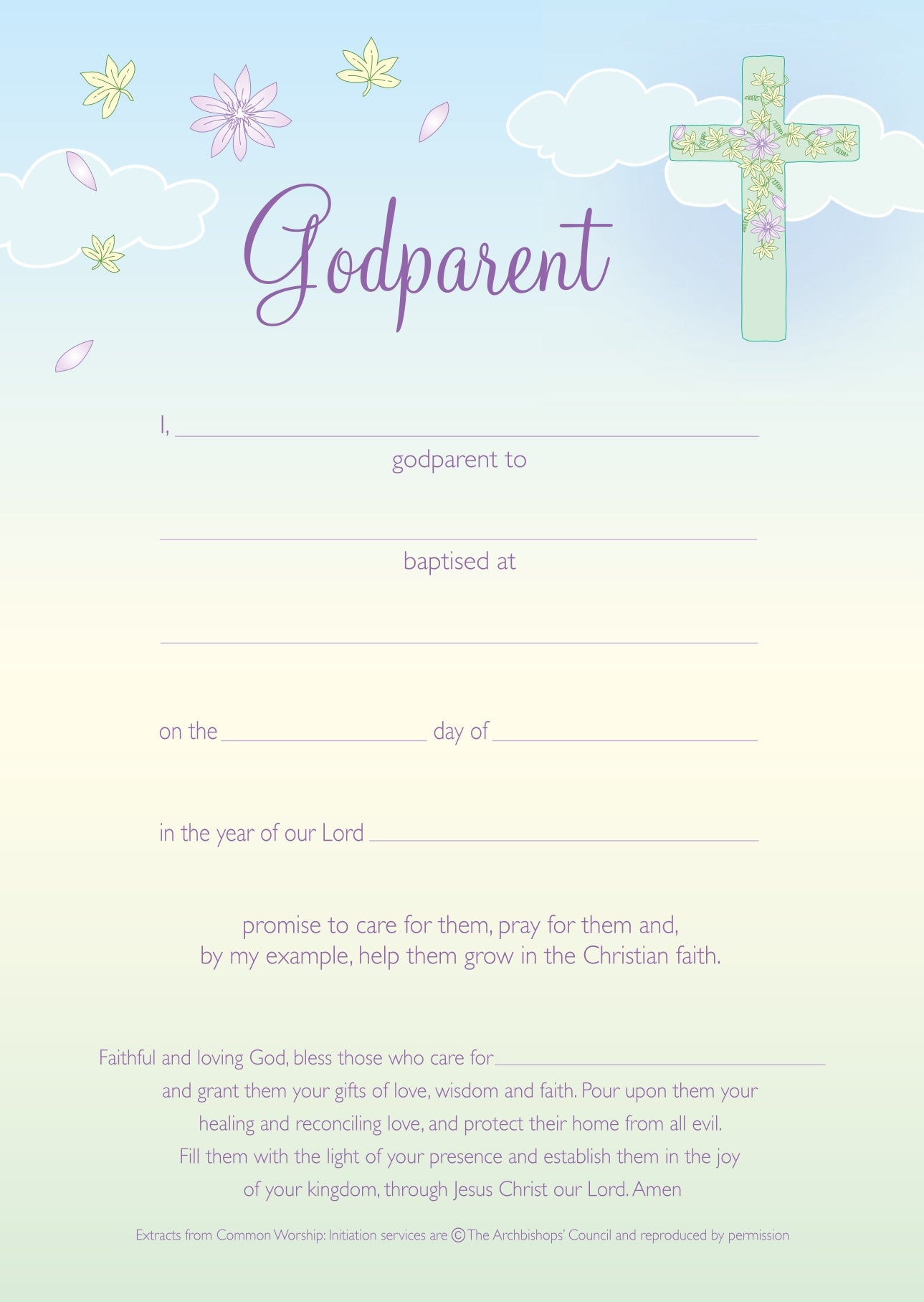 Wording: I, __________ godparent to __________ baptised at ____________ on the ____________ day of __________ in the year of our Lord __________ promise to care for them, pray for them and, by example, help them grow in the Christian faith.
