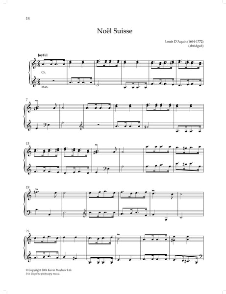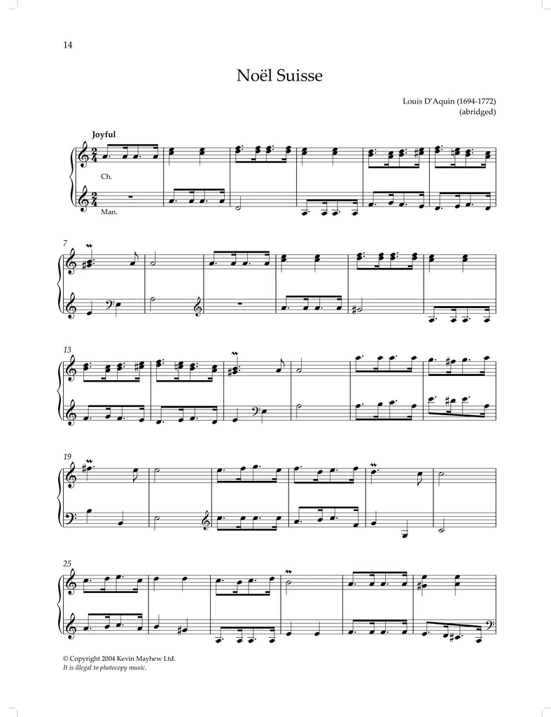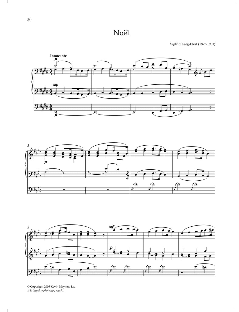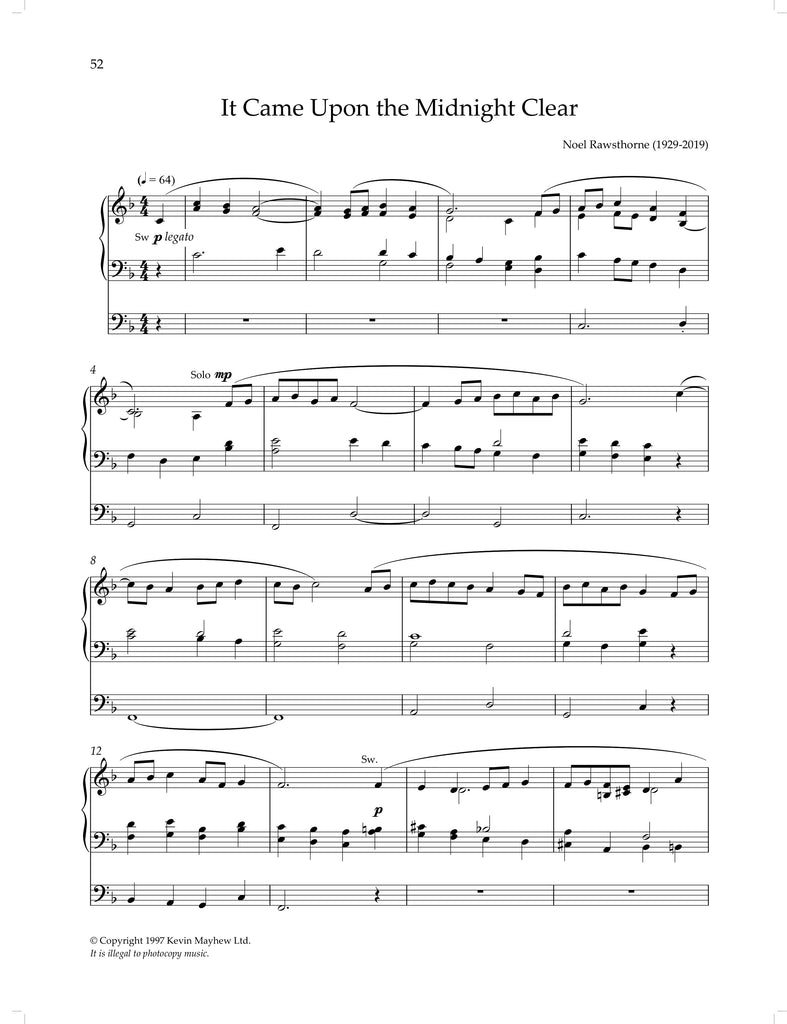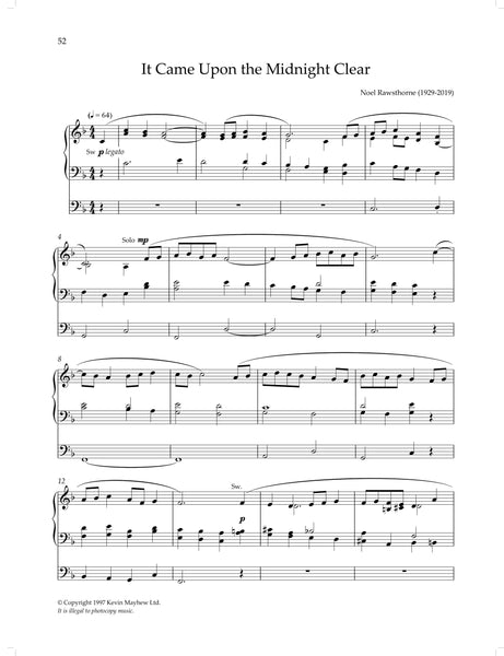 Adeste Fideles - Noel Rawsthorne Christmas Postlude - Richard Lloyd Es ist ein’ Ros’ Entsprungen - Brahms Hark, the Herald-Angels Sing - Noel Rawsthorne I Saw Three Ships - Noel Rawsthorne In Dulci Jubilo - Noel Rawsthorne In the Bleak Mid-Winter - Noel Rawsthorne It Came Upon the Midnight Clear - Noel Rawsthorne Noël - Sigfrid Karg-Elert Noël Étranger - Louis D'Aquin Noël Suisse - Louis D'Aquin O Holy Night - Adolphe Adam Offertoire sur un Noël Breton - César Franck Pastoral Symphony from ‘Christmas Oratorio’ - J.S. Bach Silent Night - Noel Rawsthorne The Shepherds’ Farewell - Hector Berlioz Veni Emmanuel - Noel Rawsthorne Vom Himmel Hoch, da Komm’ Ich Her - J.S. Bach Wassail Song - Noel Rawsthorne We Wish You a Merry Christmas - Noel Rawsthorne Wie Schön Leuchet Der Morgenstern - Buxtehude