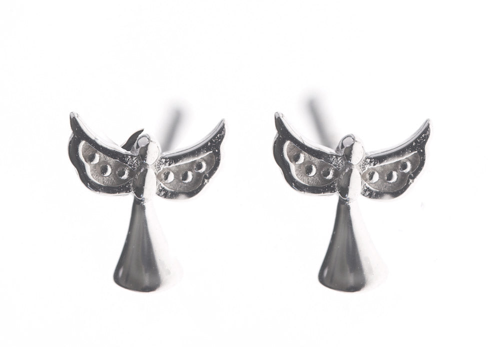 Sterling silver angel stud earrings brought to life with glittering white cubic zirconia.Please note, we are not able to accept returns of earrings for hygiene reasons unless they are faulty or defective.