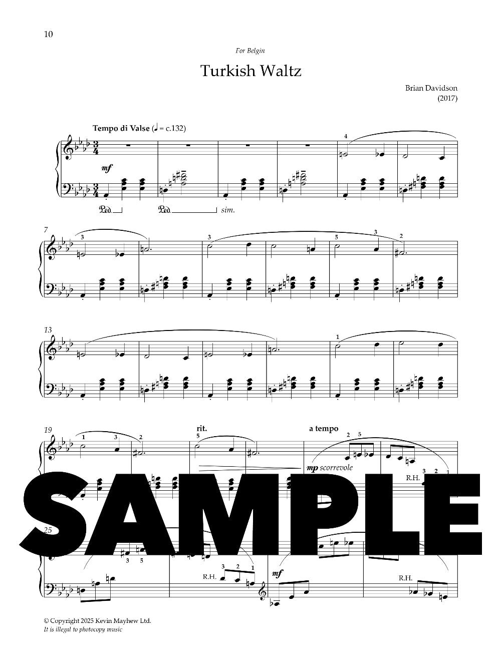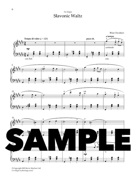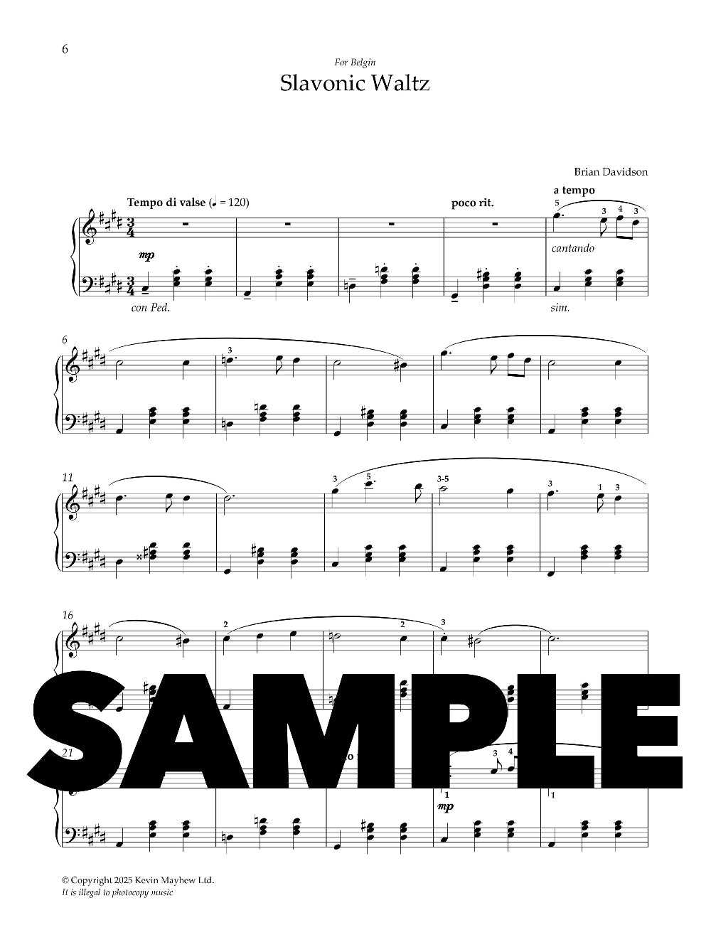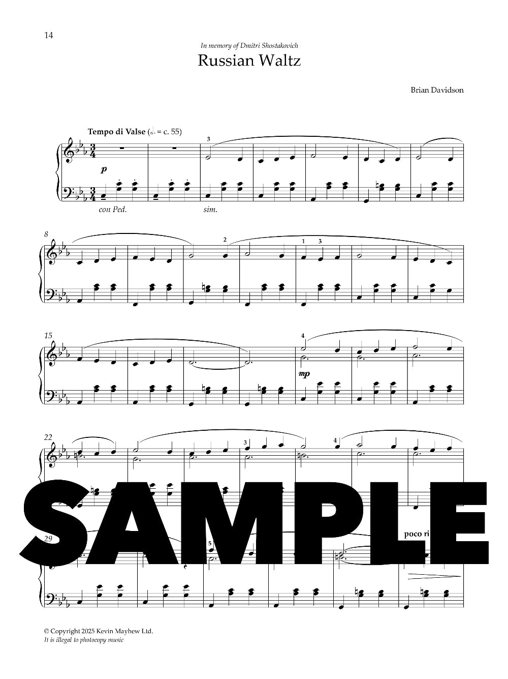 Five Romantic Waltzes by Brian Davidson offers intermediate to advanced pianists a collection of original waltzes, each with its own distinct voice and expressive palette. Begin your journey with the ‘Slavonic Waltz’, where lyrical melodies and expressive phrasing are paired with lively dance rhythms and rich harmonies. Next, the ‘Turkish Waltz’ introduces exotic flavours and rhythmic vitality, featuring bold accents and dynamic contrasts that invite spirited interpretation. The ‘Russian Waltz’ follows with deep, resonant harmonies and sweeping lines, capturing the grandeur and passion of Russian musical tradition. Pianists will find expressive markings such as cantando, poco ritardando, and con Pedale, encouraging nuanced phrasing and dynamic contrast throughout.