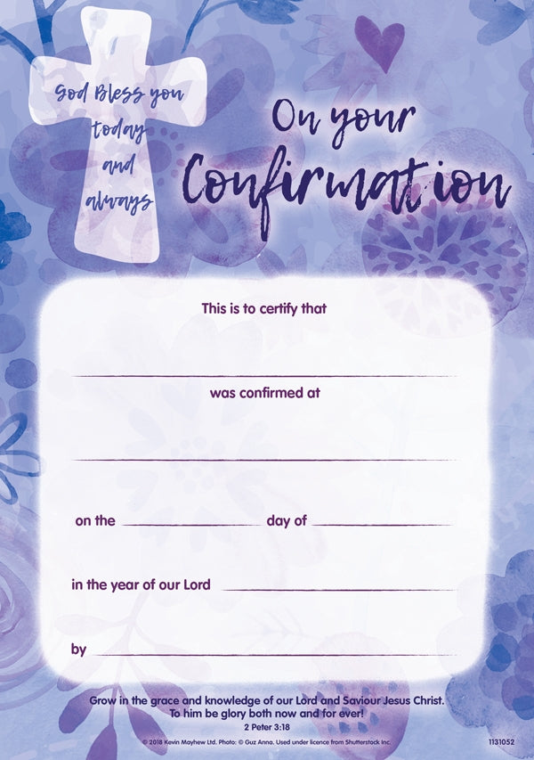 Wording:This is to certify that __________ was confirmed at __________ on the __________ day of __________ in the year of our Lord _... Read more