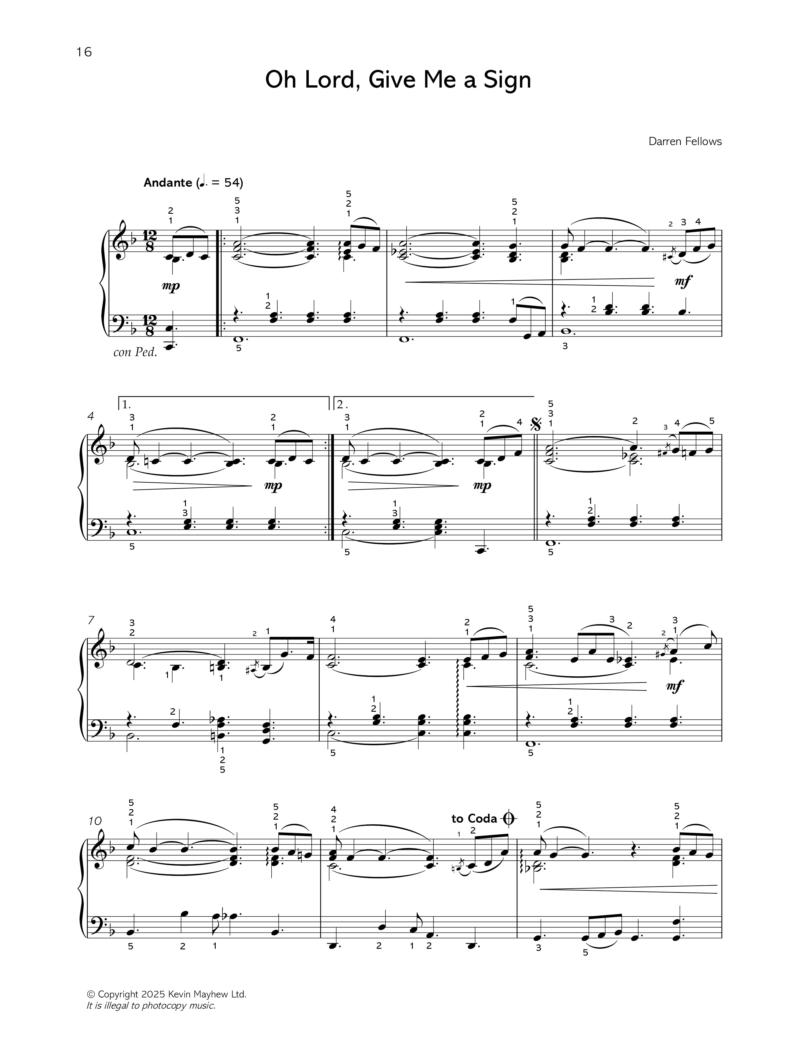 A collection of ten pieces featuring nine beloved traditional hymns and spirituals alongside one original composition by Darren Fellows. Includes 'Amazing Grace', 'Swing Low, Sweet Chariot', 'His Eye Is on the Sparrow', 'What a Friend We Have in Jesus', and the original 'Oh Lord, Give Me a Sign'.