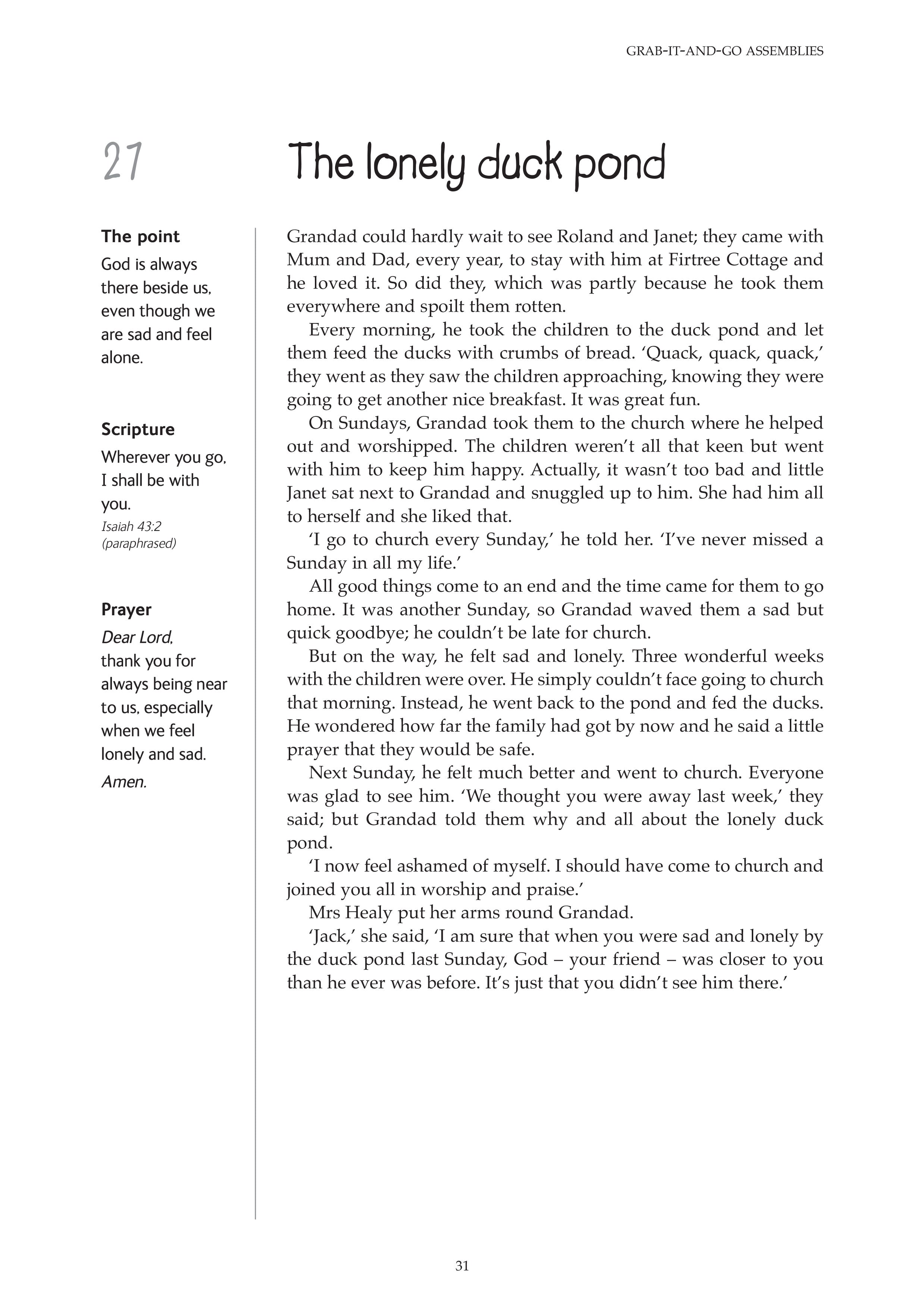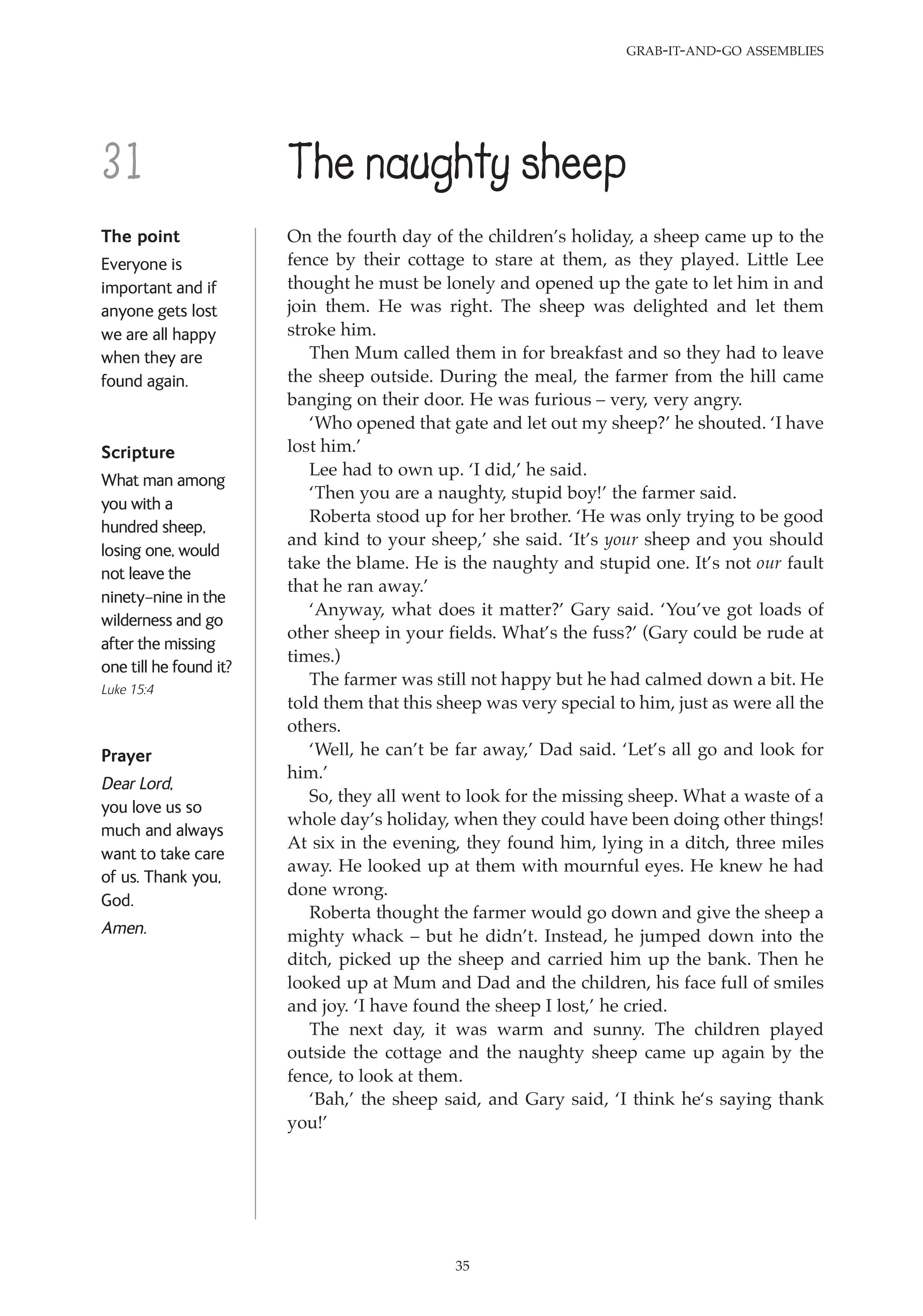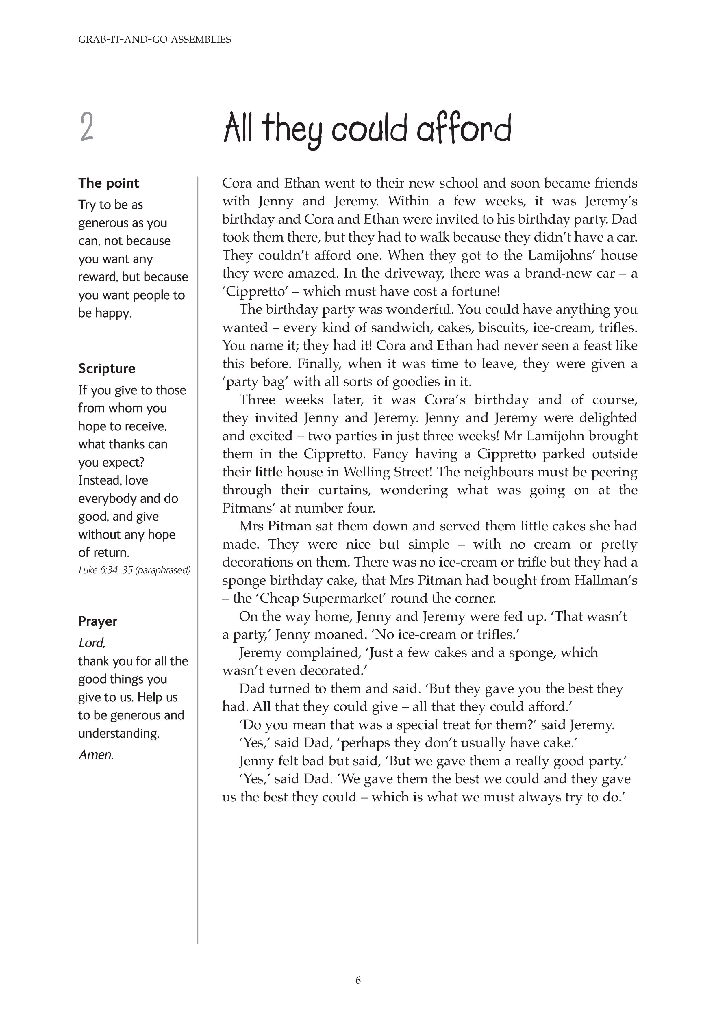 A fishy story All they could afford Always read the small print As much as you want Boco at the festival Cacky Kenny Go! You've got to go! Going back to Derryvene Just as I promised Last in the race Lost on the moor Meeting the king Neat and tidy No smoking Starving for a day The angry bowler The charity shop The crystal glass The gardener's happy surprise The ginger cat The gossips The graffiti The haunted house The holiday caravan The horrible drive The little cottage The lonely duck pond The lonely lady in the park The missing car keys The mouth of truth The naughty sheep The nosy sheep The pickled sandwiches The pigeons and the sparrows The rose garden The shanty-town kids The skinny boy The ten-pound note The turban The turnips and the turkey The twins The warm welcome The wheat field The York-share pudding Trying to earn Dad's praise Uncle Will's forgotten poems What's a body worth? When God said, 'No' When the fence fell down You can't have everything