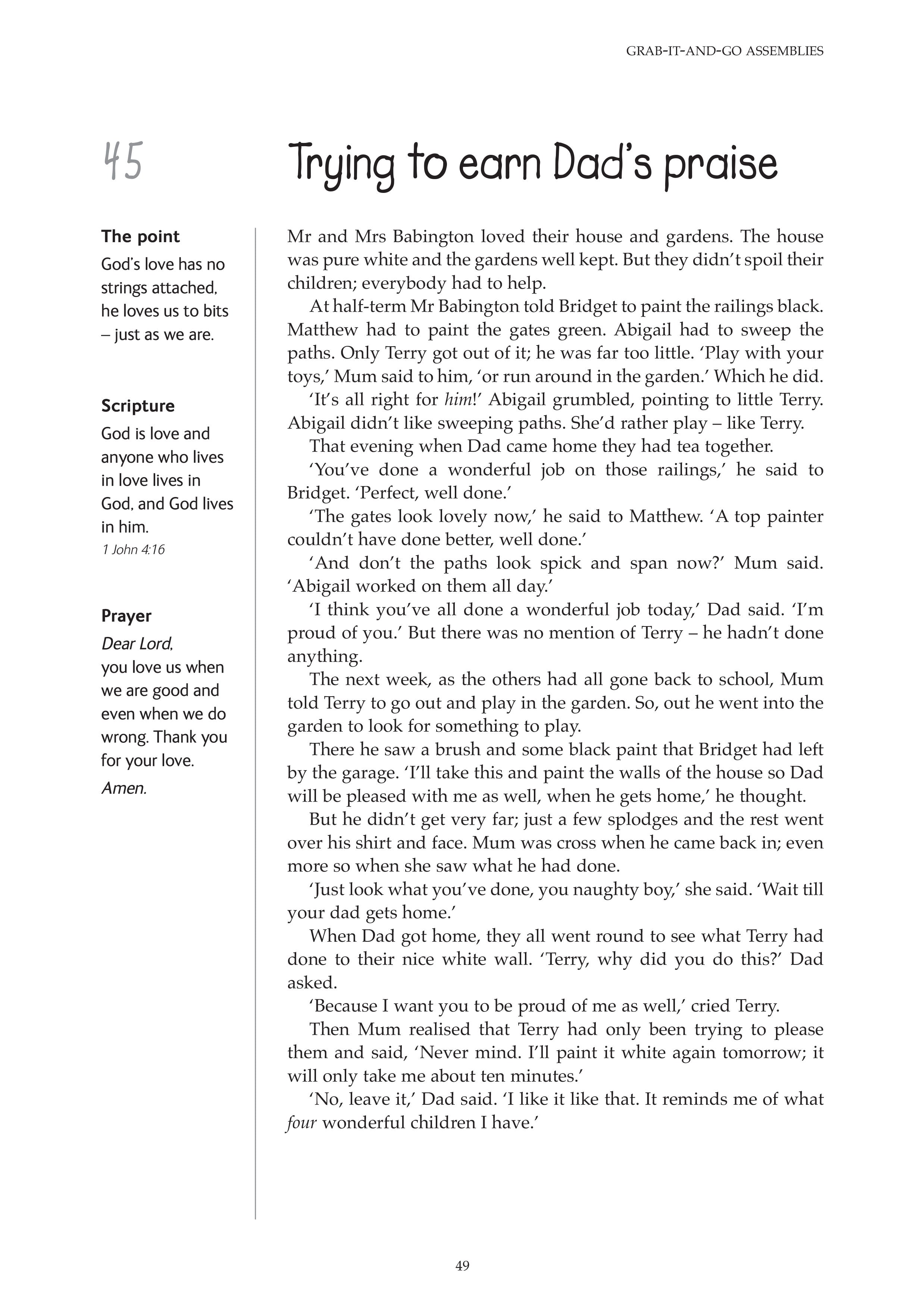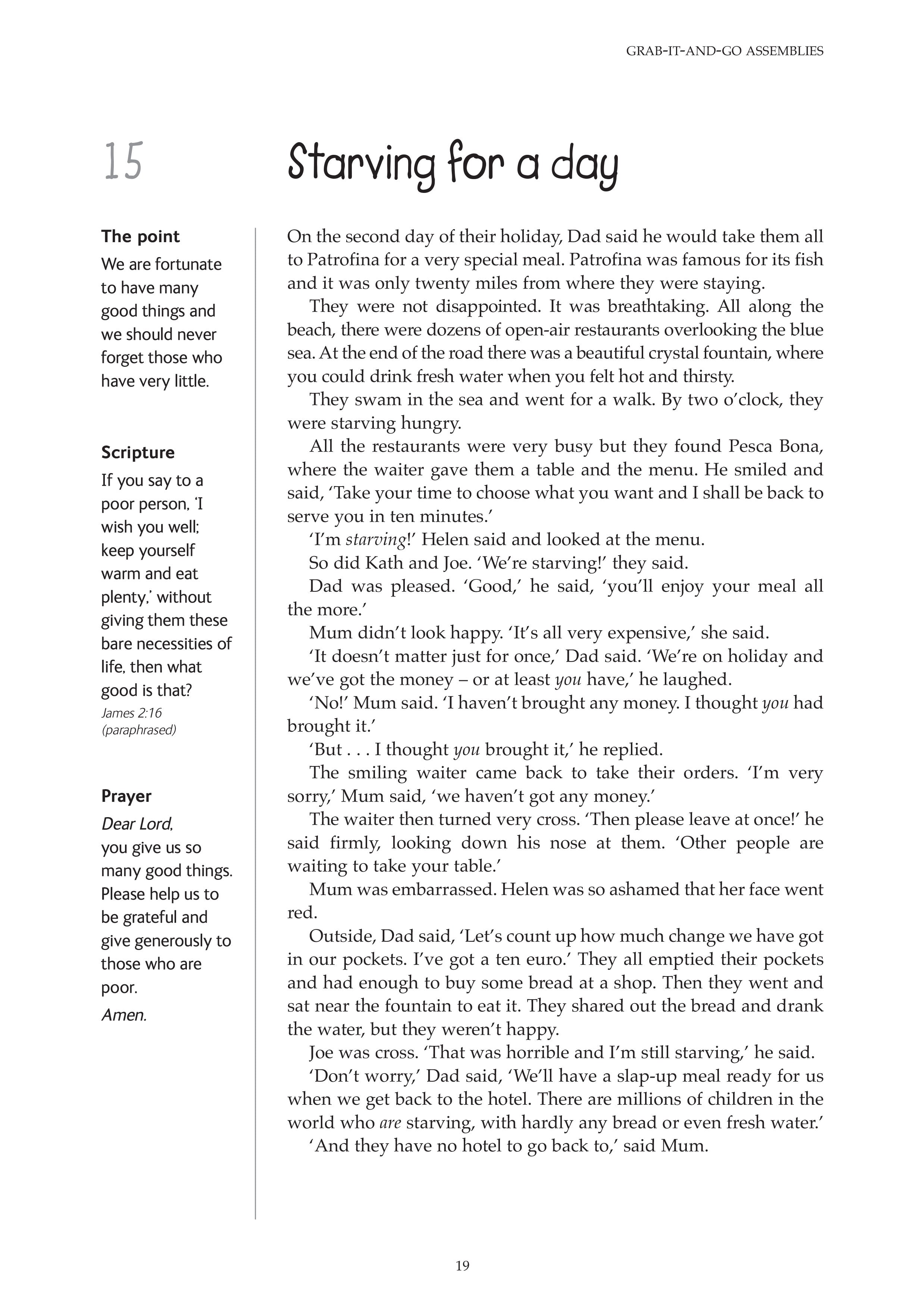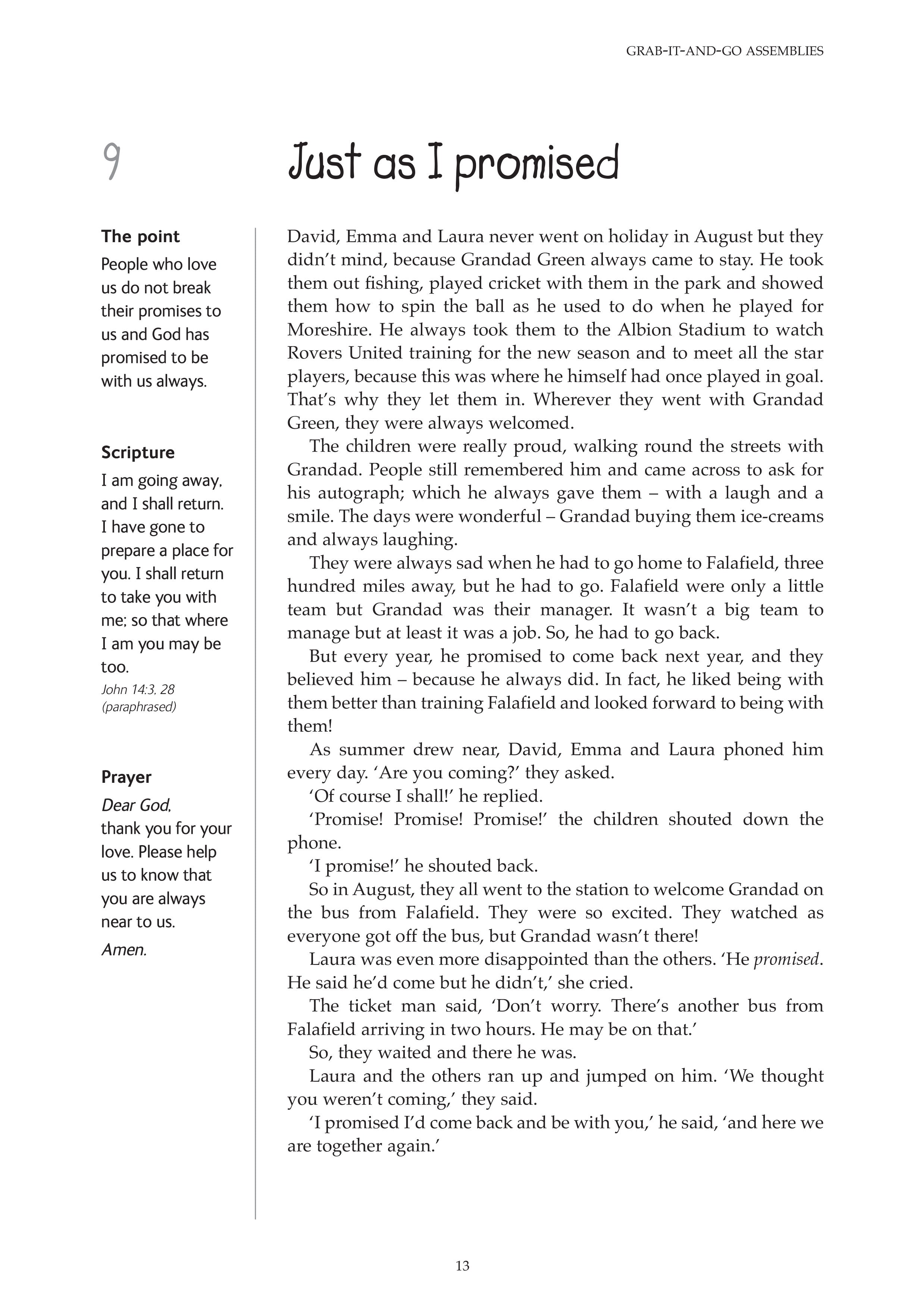 A fishy story All they could afford Always read the small print As much as you want Boco at the festival Cacky Kenny Go! You've got to go! Going back to Derryvene Just as I promised Last in the race Lost on the moor Meeting the king Neat and tidy No smoking Starving for a day The angry bowler The charity shop The crystal glass The gardener's happy surprise The ginger cat The gossips The graffiti The haunted house The holiday caravan The horrible drive The little cottage The lonely duck pond The lonely lady in the park The missing car keys The mouth of truth The naughty sheep The nosy sheep The pickled sandwiches The pigeons and the sparrows The rose garden The shanty-town kids The skinny boy The ten-pound note The turban The turnips and the turkey The twins The warm welcome The wheat field The York-share pudding Trying to earn Dad's praise Uncle Will's forgotten poems What's a body worth? When God said, 'No' When the fence fell down You can't have everything