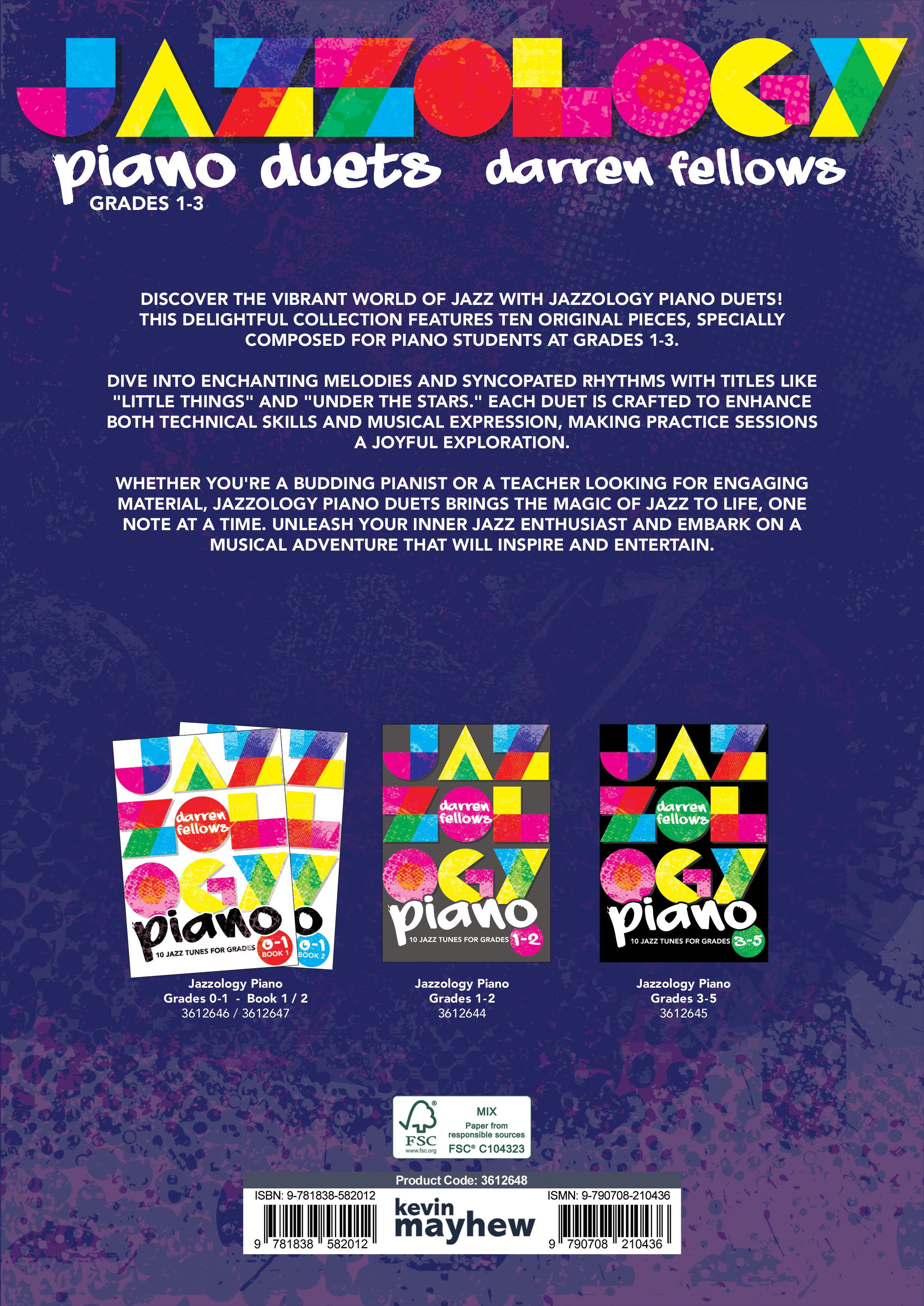 Discover the vibrant world of jazz with Jazzology Piano Duets by Darren Fellows! This delightful collection features ten original pieces, specially composed for piano students at grades 1-3. Dive into enchanting melodies and syncopated rhythms with titles like "Little Things" and "Under the Stars." Each duet is crafted to enhance both technical skills and musical expression, making practice sessions a joyful exploration. Whether you're a budding pianist or a teacher looking for engaging material, Jazzology Piano Duets brings the magic of jazz to life, one note at a time. Unleash your inner jazz enthusiast and embark on a musical adventure that will inspire and entertain.