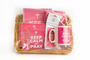 Included in this set: Trolley Coin, Coaster, Fridge Magnet, Air Freshener, Notebook, Mug, CD all with Keep Calm and Pray. Set includes a display basket.