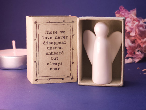 Keep the presence of loved ones close with this delicate porcelain Guardian Angel, beautifully presented in a matchbox-style box featuring the heartfelt message: "Those we love never disappear, unseen, unheard, but always near."