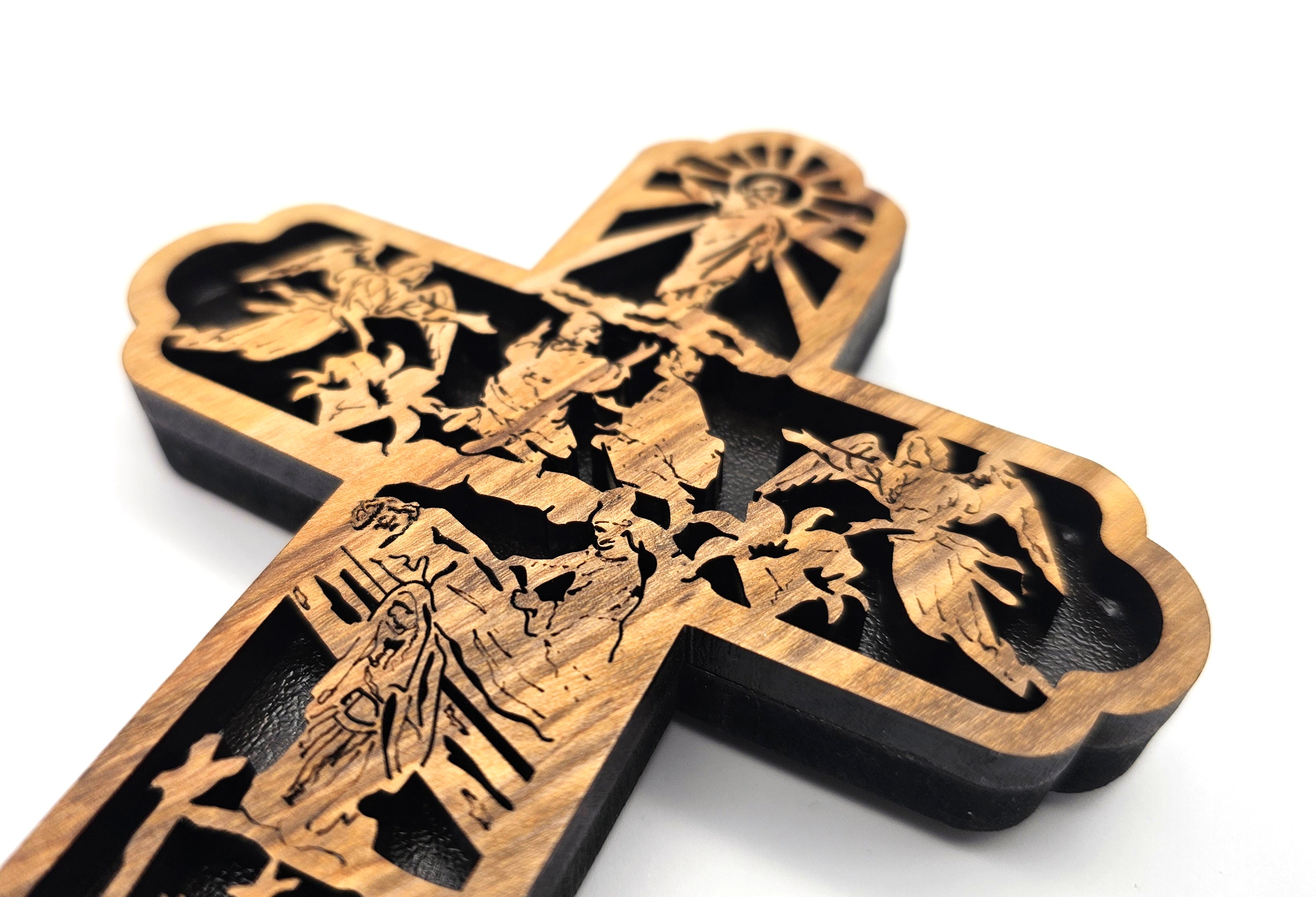The dramatic black background creates striking contrast against the natural olive wood, highlighting every detail of this sacred narrative. From Christ's triumphant ascension at the top to scenes of His earthly ministry, each element has been lovingly crafted to inspire contemplation and devotion.
