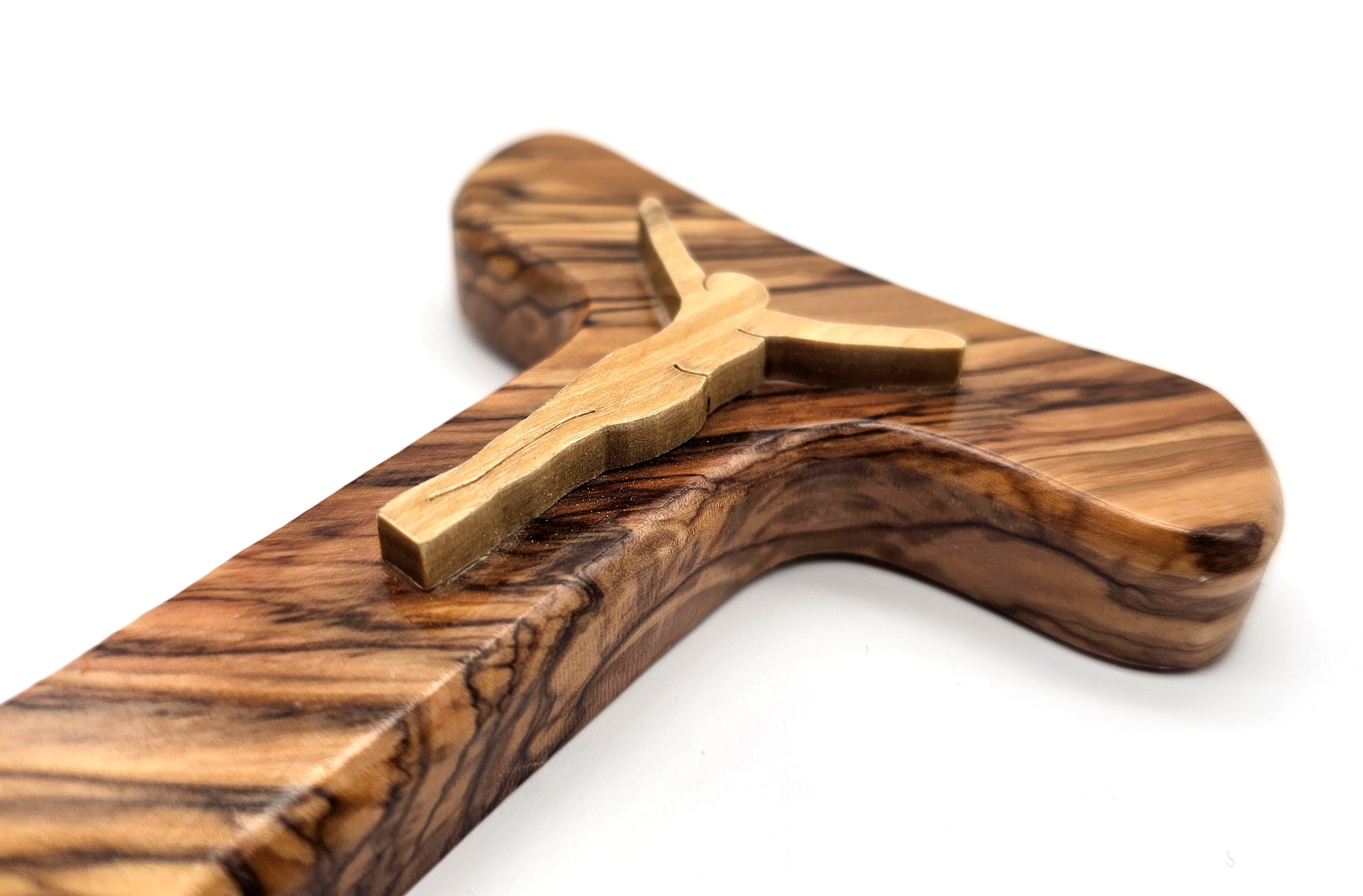 The rich, flowing grain patterns showcase the distinctive beauty that makes olive wood so treasured, whilst the carefully positioned crucifix serves as a powerful reminder of God's love and sacrifice. The smooth finish and perfect proportions make this cross ideal for personal prayer, meditation, or as a focal point in your sacred space.