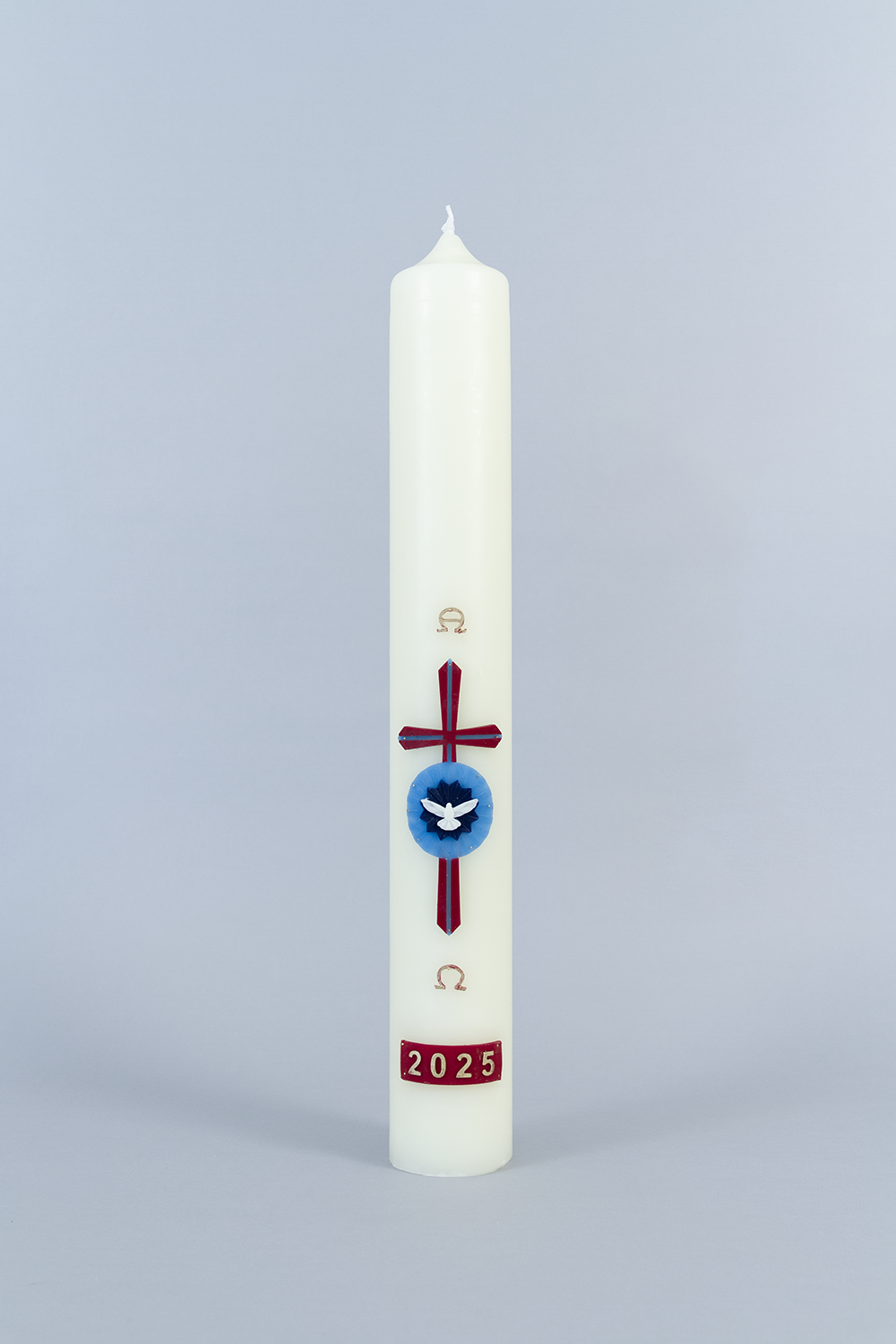 The Easter candle boasts a stunning ornamentation of a flying white dove, symbolizing peace and the Holy Spirit. Centred in a vibrant blue star, the dove is framed by dynamic red lines, evoking passion and sacrifice. This elegant design radiates hope and spiritual renewal.