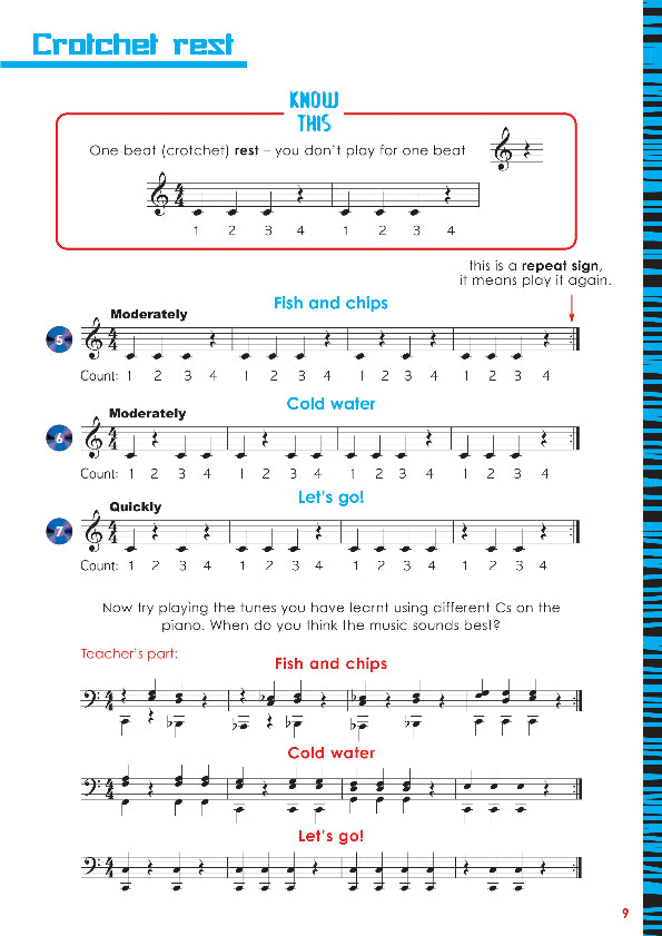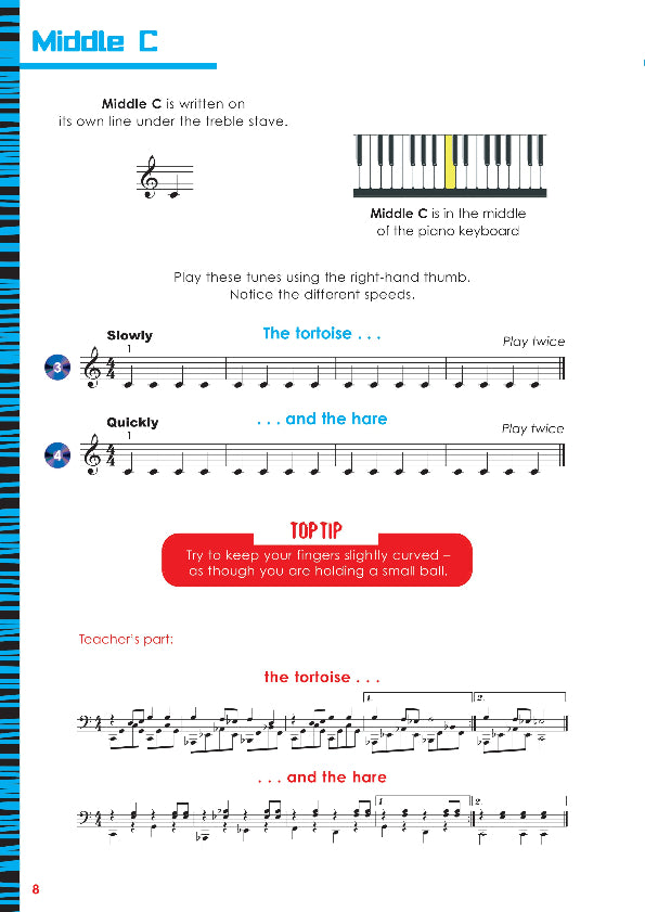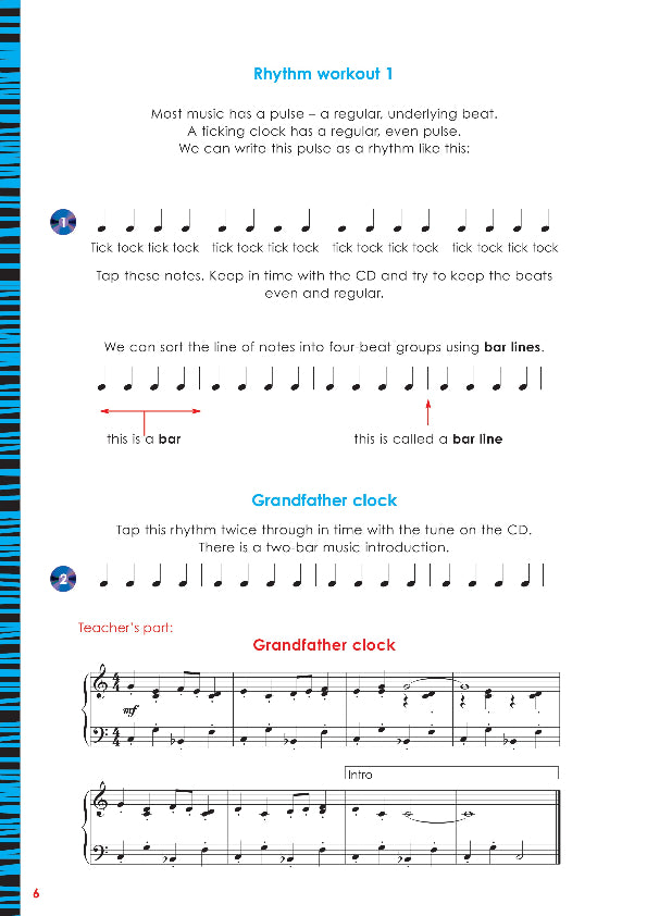 Rhythm Workout 1 Grandfather Clock The Tortoise ... and the hare Fish and Chips Cold Water Let's go! Walk the Dog Red Peppers Beach party Lazy Day Boogie Roll Entry of the Gladiator Morning Rock Solid Left-hand Workouts Off To Town Jump To It Rhythm Workouts 2 Three's Company The Beach Jamaica Hello Musette German Folk Tune Right-hand Workouts Pogo Waltz March Past Left-hand Workouts Fanfare Go For Gold Swing It Rhythm Workout 3 Finger Workouts Copycat Country Dance Dawn Dynamic Study Uptown Hop It! Highway Jogging Take A Break Bouncing Bean Razzle Dazzle Step On It Hot Cross Buns Bass Dance Fiddlesticks Rhythm Workout 4 Hop, Skip And Jump Pineapple 1, 2, 3 Go! The Rock After The Storm Spiral Staircase