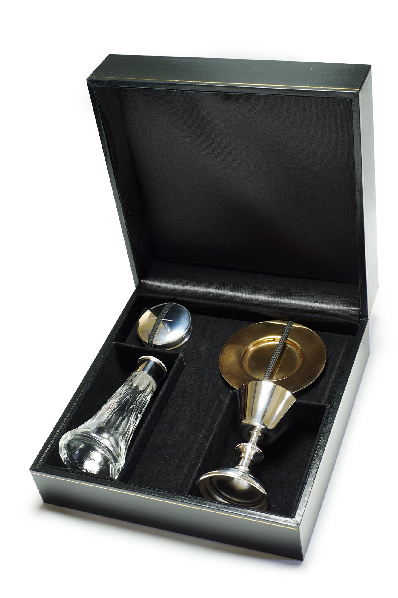 Presentation Ordination Set 4 Piece offers four pieces: silver-plated chalice (3 3/8" high - 1 fl oz), glass cruet with silver-plated top (4 1/2" high - 2 fl oz), silver-plated paten (3 1/4" diameter) and silver-plated pyx inside a case with black velvet interior.
