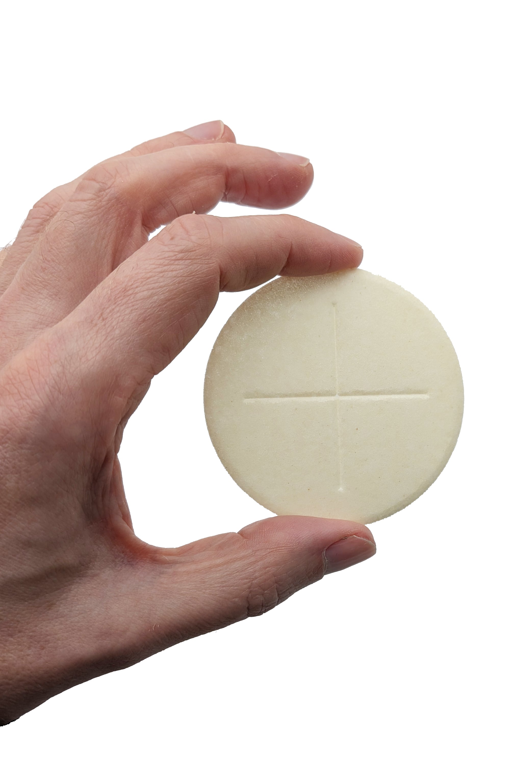 These wafers are made from pure wheat flour and water and feature a sealed edge to prevent crumbling. Each wafer is embossed with a traditional single cross design.