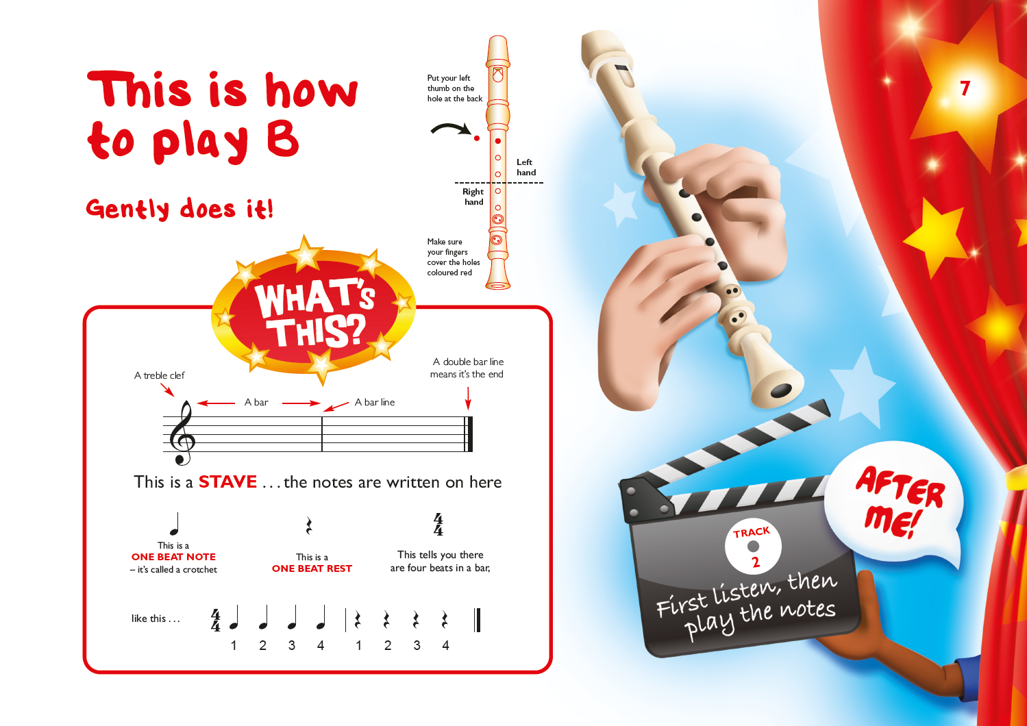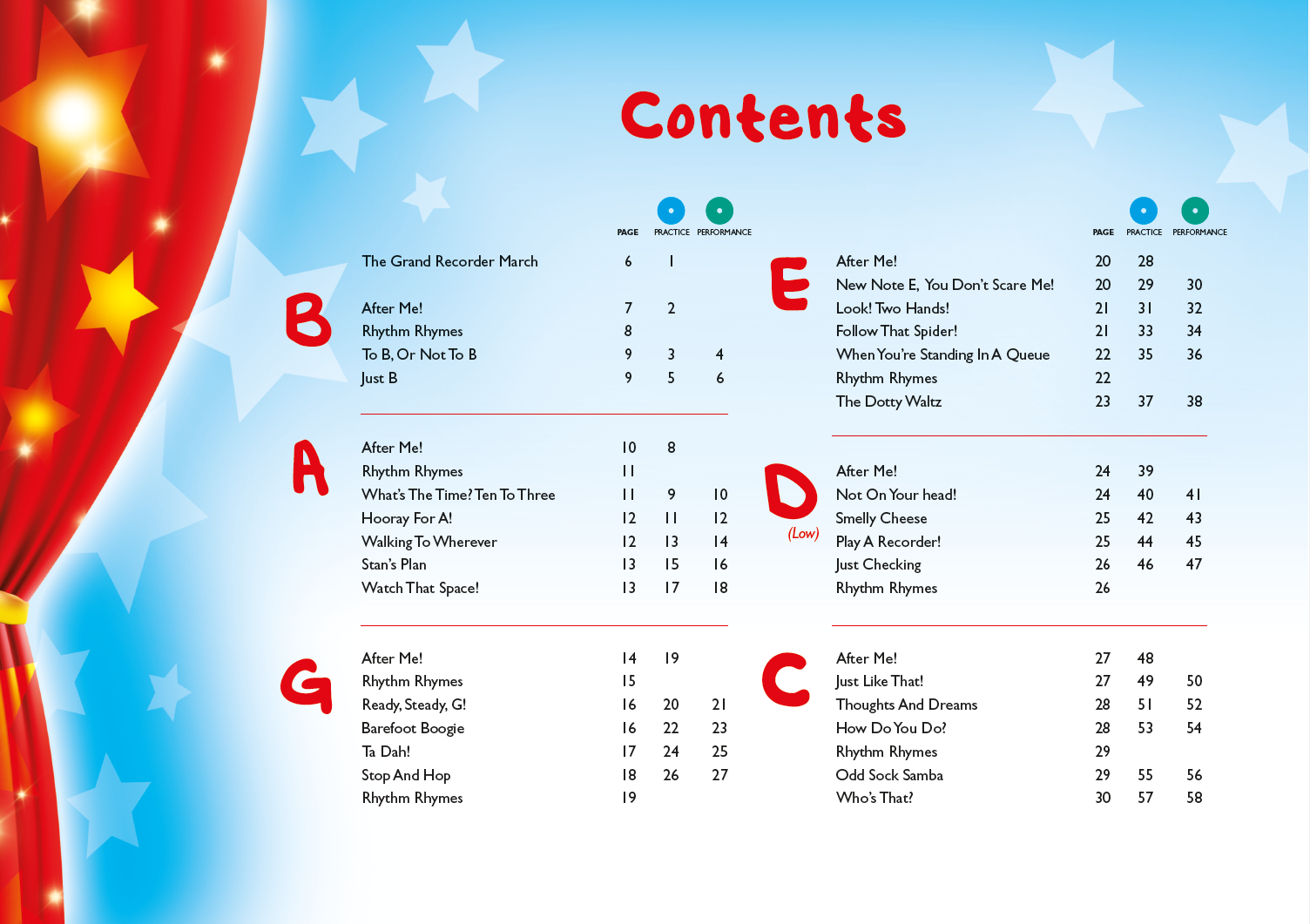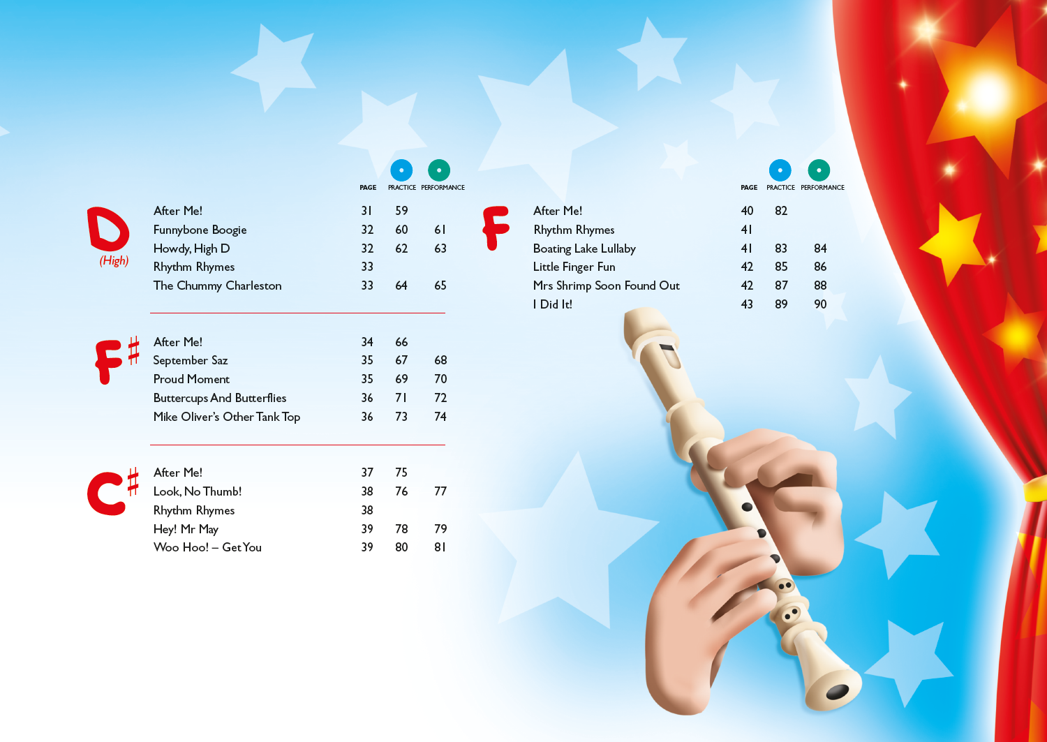 The Grand Recorder March After Me! Rhythm Rhymes To B, Or Not To B Just B After Me! Rhythm Rhymes What's The Time? Ten To Three Hooray For A! Walking To Wherever Stan's Plan Watch That Space! After Me! Rhythm Rhymes Ready, Steady, G! Barefoot Boogie Ta Dah! Stop And Hop Rhythm Rhymes After Me! New Note E, You Don't Scare Me! Look! Two Hands! Follow That Spider! When You're Standing In A Queue Rhythm Rhymes The Dotty Waltz After Me! Not On Your head! Smelly Cheese Play A Recorder! Just Checking Rhythm Rhymes After Me! Just Like That! Thoughts And Dreams How Do You Do? Rhythm Rhymes Odd Sock Samba Who's That? After Me! Funnybone Boogie Howdy, High D Rhythm Rhymes The Chummy Charleston After Me! September Saz Proud Moment Buttercups And Butterflies Mike Oliver's Other Tank Top After Me! Look, No Thumb! Rhythm Rhymes Hey! Mr May Woo Hoo! - Get You After Me! Rhythm Rhymes Boating Lake Lullaby Little Finger Fun Mrs Shrimp Soon Found Out I Did It!