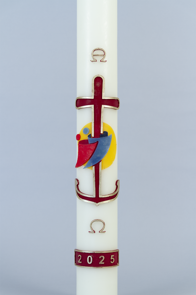 This candle, adorned with a radiant yellow sun, symbolizes resurrection and new beginnings. Delicate pilgrimage motifs encircle the sun, depicting tiny figures journeying through serene landscapes, towards salvation. An anchor symbolizes hope, stability, faith, and God's unwavering support. Each detail adds a sense of sacred motion, making the candle a beacon of faith and devotion.