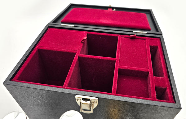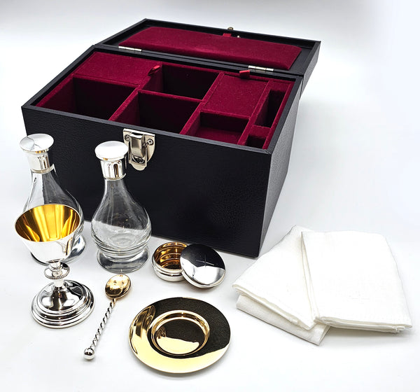 This delightful Georgian communion set offers six pieces in Silver plate: chalice (3 1/8in high), two glass cruets (each 4in high - 2 3/4 fl oz), paten (3 1/8in diameter), pyx and spoon inside a sturdy wooden case with velvet interior and leather-look veneer.