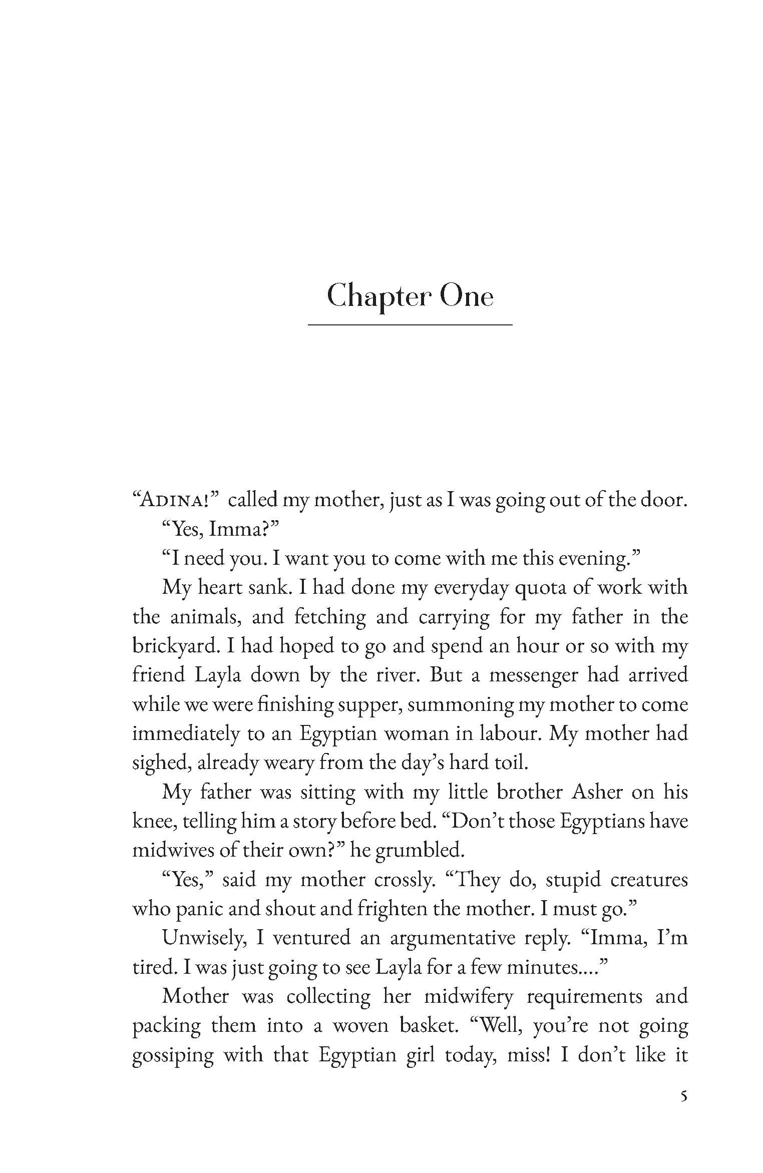 Twelve-year-old Adina dreams of freedom - but as a Hebrew slave, her days are filled with hard work and strict rules. When her fierce, no-nonsense mother drags her along to help deliver an Egyptian baby, Adina is thrust into the dangerous world of midwifery - and into a growing storm that could change everything.
