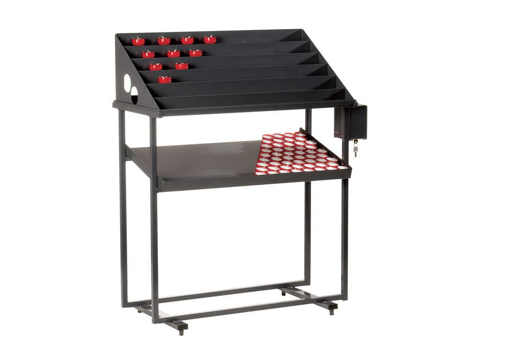 This solid votive light stand holds 90 lights with storage space for a further 140. It features a lockable money box and measures H3' 5" x W2'6" x D1' 3".