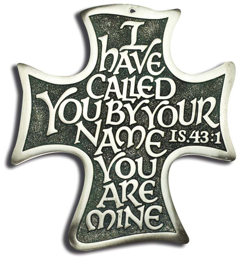 I have called you by your name you are mine (Isaiah 43:1)6" Solid Polished Pewter Cross with raised calligraphy letters.